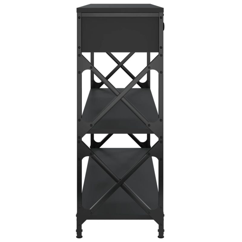 Добавете нотка елегантност към вашето антре, всекидневна или коридор с тази стилна конзолна маса. Издържлив материал: Инженерната дървесина е с изключително качество с гладка повърхност и също така се отличава със здравина, стабилност и устойчивост на влага. Изработена от инженерно дърво, холната маса е лесна за почистване.Достатъчно място за съхранение: Холната маса предлага достатъчно място за съхранение, за да съхранявате вашите списания, книги, декоративни предмети и други ежедневни неща добре организирани и на достъпно място.Регулируеми крачета: Четири регулируеми крачета с пластмасови подложки поддържат страничната масичка балансирана на неравен терен и увеличават стабилността.Метална рамка: Металната рамка добавя индустриален стил към вашия интериор, като същевременно гарантира издръжливост и стабилност. Масата за антре има напречни греди с X-образна рамка за допълнителна стабилност, така че не е нужно да се притеснявате от клатушкане на пода. Внимание:За предотвратяване на преобръщане този продукт трябва да се използва с предоставения анкер за стена.