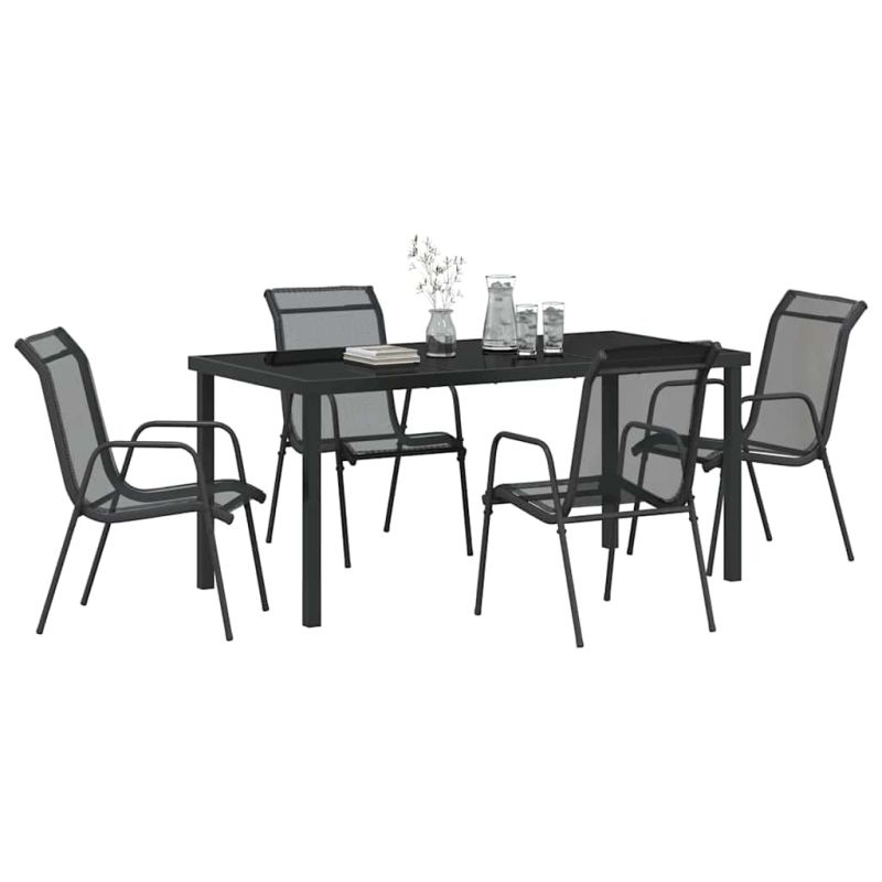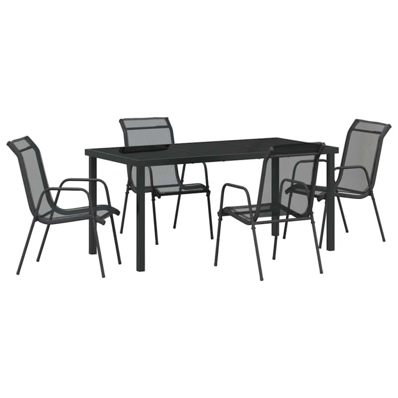 Този съвременен комплект за градината е направен, за да подобри вашите открити събития. Съчетава модерен стил с практичност. Лъскавото черно покритие на стоманената рамка се вписва отлично във всяка градина или тераса, предлагайки универсален вид, който е едновременно елегантен и удобен. Правоъгълната форма и изчистените линии създават перфектен комплект за хранене или просто за почивка на открито. Здрава прахова обработка: Стоманената рамка е с прахово покритие, което я прави много устойчива на различни метеорологични условия. Този защитен слой я запазва и в красив вид през цялата година. Бързосъхнеща текстилна материя: Седалките са направени от текстил, който съхне бързо. Трябва ви само малко дъжд или роса и те вече са готови за използване. Мрежестата структура осигурява отлична циркулация на въздуха за още по-голям комфорт. UV-устойчиви материали: Изработен от материали, устойчиви на избледняване и увреждане от UV лъчите, той запазва ярките си цветове и форма дори при дълго излагане на слънце. Съвременен функционален дизайн: С минималистичен стил, чисти линии и черно покритие, комплектът лесно се вписва в различни стилове на декорация на открито. Простият, но практичен дизайн предлага удобство без излишни украшения. Лесна поддръжка: Поради устойчивия си дизайн, поддръжката е улеснена. Използването на защитно покритие, когато не го използвате, ще удължи живота му, поддържайки комплекта в отлично състояние за много срещи напред.
