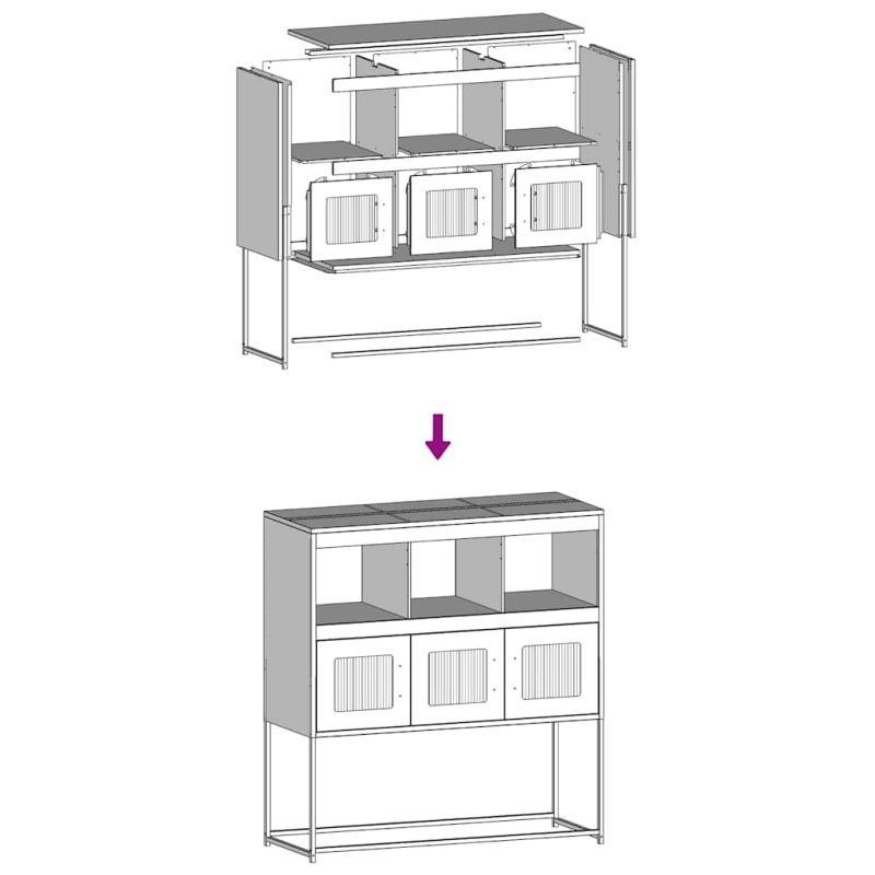 Този бюфет предлага едновременно декоративна визия и практично място за съхранение, което го прави идеално допълнение към дома ви. Стабилна и дълготрайна рамка: Стоманата е здрава, стабилна и издръжлива, което я прави идеален избор за широк спектър от приложения, от производството на мебели до строителството.Практични дръжки: Шкафът за съхранение е снабден с дръжки, които осигуряват удобен захват, помагат за лесното отваряне и затваряне на шкафа и придават допълнителна красота.Голямо пространство за съхранение: Бюфетът предлага достатъчно място за съхранение на основни неща за хранене и други домакински вещи, за да бъдат те подредени и достъпни.Метални крака: Металните крака добавят спокоен стил към вашия интериор, като същевременно осигуряват стабилност.Широки приложения: Можете да използвате този страничен шкаф като шкаф за баня или кухненски шкаф, или просто като елегантен шкаф за съхранение в спални, тоалетни, антрета, коридори и офиси, трапезарии и други жилищни помещения. Внимание:За да предотвратите преобръщане, този продукт трябва да се използва с предоставеното устройство за закрепване на стена.