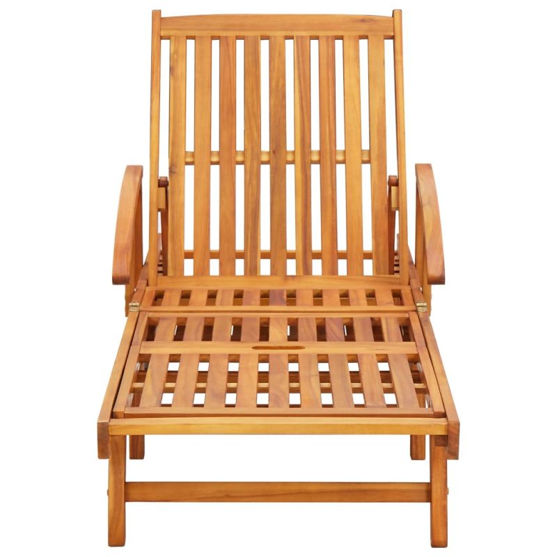 Този комплект дървени шезлонги съчетава стил и функционалност и ще добави рустик чар в градината, вътрешния двор, зоната около басейна или друго външно жилищно пространство. Изработен от масивна акациева дървесина, шезлонгът е устойчив на атмосферни влияния, издръжлив и подходящ за употреба на открито. Снабден е с колелца и може лесно да се премества. Облегалката за гърба и подложката за крака могат да се регулират от напълно изправено положение до напълно хоризонтално положение, което ви осигурява максимален комфорт. Шезлонгът може да се сгъва, когато не се използва. Включената в комплекта възглавница е повече от практично допълнение; тя има и декоративна функция. Забележка: За да удължите живота на вашите градински мебели, препоръчваме ви да ги почиствате редовно и да не ги оставяте ненужно на открито без защита.Почистване: Използвайте мек сапунен разтвор.Съхранение: Ако е възможно, съхранявайте на хладно и сухо място на закрито. Ако продуктът се съхранява на открито, защитете го с водоустойчиво покривало. Избършете и изсушете излишната вода или сняг от плоските повърхности след дъжд или снеговалеж. Позволете достатъчно циркулация на въздуха, за да избегнете повреди, свързани с влагата.