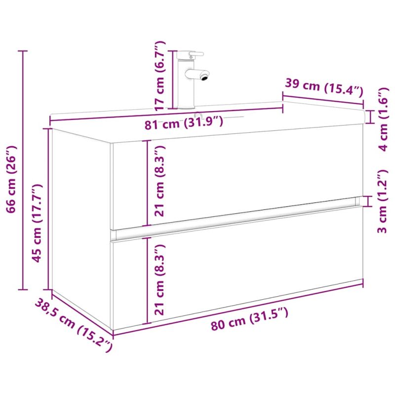 Този стилен шкаф за мивка с вграден умивалник и смесител, разполагащ с просторно пространство за съхранение, е отлично допълнение към вашата баня, като ѝ придава подреден и впечатляващ вид! Здрави материали: Шкафът под мивката е изработен от изключително качествен материал с гладка повърхност, който се отличава със здравина, стабилност и устойчивост на влага.Достатъчно място за съхранение: Модулът за мивка за баня разполага с чекмедже, което предлага достатъчно място за съхранение за вещи във вашата баня.Практичен дизайн: Плотът на този шкаф за баня е идеален за поставяне на мивката.Функция за стенен монтаж: Шкафът за баня може да се монтира на стена за допълнително място за съхранение. По този начин можете да увеличите максимално пространството на пода и да поддържате чистота.Преливник: Също така е оборудвана с преливник за изтичане на вода, когато се напълни твърде много. Добре е да се знае:Винт(ове) и щепсел(и) за вътрешността на стената не са включени. Търсете и използвайте винт(ове) и дюбел(и), подходящи за вашите стени. Ако не сте сигурни, потърсете професионална помощ. Прочетете и следвайте внимателно всяка стъпка от инструкциите.Включени са смесител и сифон клик-клак с преливник.Смесителят е за топла и студена вода, като при нужда от топла вода трябва да се свърже бойлер. Децата трябва да бъдат наблюдавани, за да се гарантира, че няма да си играят с уреда. Пазете децата далеч от зоната за сглобяване.Внимание: Прочетете внимателно инструкциите преди употреба и ги запазете за по-нататъшни справки.
