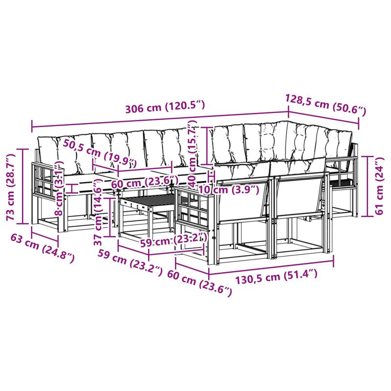 Този комплект за външни мебели съчетава стил и практичност, правейки всяка градина или тераса впечатляваща. С модерен дизайн и чисти линии, той добавя елегантност и е идеален за почивка на открито и социални събирания. Направен от масивна акациева дървесина, комплектът е дълготраен и визуално привлекателен, чудесен избор за тези, които търсят както стил, така и удобство в градинските мебели. Издръжлива масивна акациева дървесина: Направен от масивна акациева дървесина, този комплект е здрав и устойчив на външни условия. Солидната конструкция предлага надеждна опора и дълготрайност, а топлият естествен цвят допълва всяка градина или тераса. Водоустойчив дизайн: Този комплект мебели има защитно покритие, което осигурява допълнителна защита срещу слънце и дъжд. Лакираната повърхност помага за поддържане на добрия вид и функция, предлагаща дълготрайност за градината, терасата или двора. Компоненти и дизайн: Всеки елемент от подлакътниците до облегалките е проектиран за стил и функция. Поддържащите характеристики осигуряват комфорт, а координираният дизайн предлага визуално хармонично усещане, подходящо за всякакви случаи на открито. Комфорт и многофункционалност: Модулният дизайн позволява различни конфигурации, за да отговарят на нуждите. Идеален за релаксация, социални събирания или четене на книга, комплектът лесно се приспособява към всяка открита среда, максимизирайки комфорт и полезност. Лесна поддръжка: За да запазиш мебелите, просто избършете с влажна кърпа и избягвайте остри почистващи агенти. Редовната грижа помага да се запази външния вид и удължава живота на мебелите.
