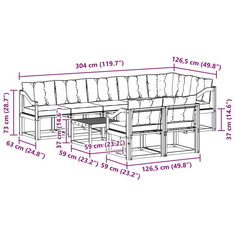 Този комплект за външни мебели съчетава стил и практичност, правейки всяка градина или тераса впечатляваща. С модерен дизайн и чисти линии, той добавя елегантност и е идеален за почивка на открито и социални събирания. Направен от масивна акациева дървесина, комплектът е дълготраен и визуално привлекателен, чудесен избор за тези, които търсят както стил, така и удобство в градинските мебели. Издръжлива масивна акациева дървесина: Направен от масивна акациева дървесина, този комплект е здрав и устойчив на външни условия. Солидната конструкция предлага надеждна опора и дълготрайност, а топлият естествен цвят допълва всяка градина или тераса. Водоустойчив дизайн: Този комплект мебели има защитно покритие, което осигурява допълнителна защита срещу слънце и дъжд. Лакираната повърхност помага за поддържане на добрия вид и функция, предлагаща дълготрайност за градината, терасата или двора. Компоненти и дизайн: Всеки елемент от подлакътниците до облегалките е проектиран за стил и функция. Поддържащите характеристики осигуряват комфорт, а координираният дизайн предлага визуално хармонично усещане, подходящо за всякакви случаи на открито. Комфорт и многофункционалност: Модулният дизайн позволява различни конфигурации, за да отговарят на нуждите. Идеален за релаксация, социални събирания или четене на книга, комплектът лесно се приспособява към всяка открита среда, максимизирайки комфорт и полезност. Лесна поддръжка: За да запазиш мебелите, просто избършете с влажна кърпа и избягвайте остри почистващи агенти. Редовната грижа помага да се запази външния вид и удължава живота на мебелите.