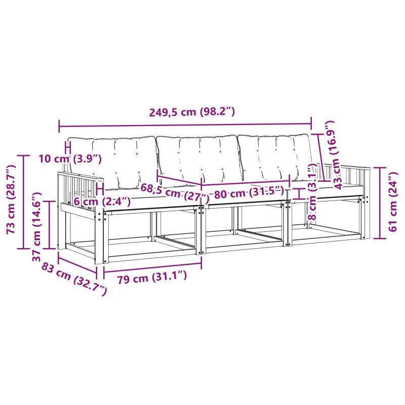 Комплектът за външни мебели свързва стил и функция, добавяйки зашеметяващ акцент на вашата градина или тераса. С модерен дизайн и чисти линии, той внася елегантност, докато предлага пространство за релаксация на открито и социални събирания. Изработен от масивна акациева дървесина, комплектът е издръжлив и красив, което го прави идеален избор за практични и стилни outdoor мебели. Издръжлива масивна акациева дървесина: Комплектът е изработен от здрава акация, устойчива на outdoor условия. Сигурен и стабилен, той с топлия си цветен тон се вписва прекрасно в градина или тераса. Влагоустойчив дизайн: Лакираната повърхност добавя защита от слънце и дъжд. Полираният завършек запазва отличния вид и функцията на мебелите, осигурявайки дълготрайност. Компоненти и дизайн: Всеки детайл, включително подлакътниците и облегалките, е проектиран за стил и комфорт. Подкрепящите характеристики и координираният дизайн гарантират визуална съгласуваност за всякакви поводи. Комфорт и многофункционалност: Модуларният дизайн предлага различни конфигурации за различни пространства и нужди. Идеален е за релаксация, социални събития или спокойно четене на книга. Комплектът лесно се приспособява към всяка outdoor атмосфера. Лесна поддръжка: За да запазите мебелите в добро състояние, просто ги избърсвайте с влажна кърпа и избягвайте агресивни почистващи средства. Редовната грижа помогне за поддържане на визията и удължава живота на мебелите.