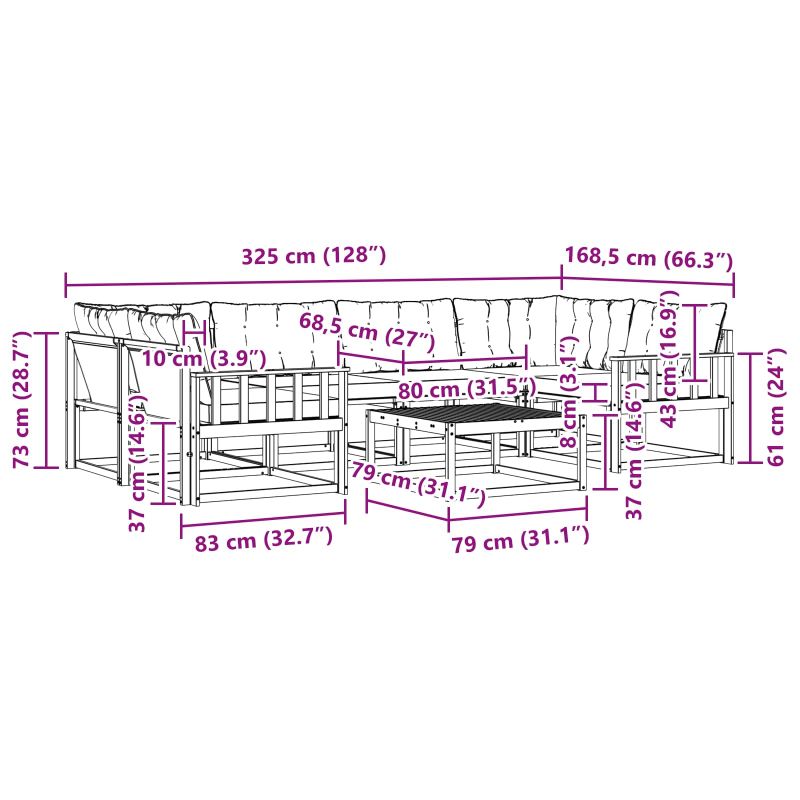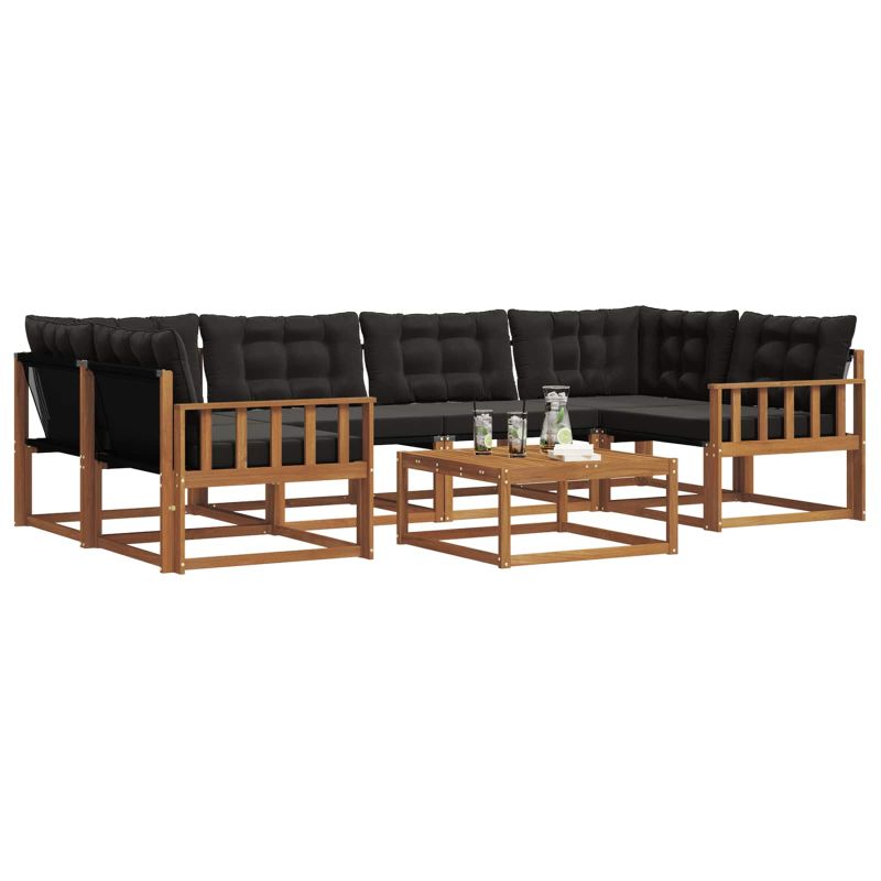 Този комплект за градински мебели комбинира стил и функция, създавайки впечатляваща част за всяка градина или тераса. Модерният му дизайн с изчистени линии и минималистичен вид внася елегантност, идеална за релаксиращи моменти и социални събирания. Изработен напълно от масивна акациева дървесина, комплектът осигурява дълготрайност и визуална привлекателност - перфектен за тези, които искат стил без компромиси с практичността. Издръжлив масивен акациев дървен конструкция: Изработен от масивно акациево дърво, този комплект мебели за открито е устойчив на всякакви метеорологични условия. Здравата му конструкция гарантира сигурност и дълготрайност, а топлият естествен цвят се вписва идеално в градината или на терасата. Устойчивост на времето: С лакирана повърхност, комплектът предлага защита от слънце и дъжд, запазвайки както външния си вид, така и функционалността дълго време. Компоненти и дизайн: Всяка част от комплекта - от подлакътниците до облегалките, е проектирана за стил и практичност. Поддържащите функции предлагат допълнителен комфорт, а съгласуваният дизайн гарантира естетичен вид, подходящ за всякакви поводи. Комфорт и разнообразие: С модулна структура, комплектът е супер гъвкав, идеален за тераси, открити събития или приятни моменти на четене. Лесно се настройва за максимален уют и удобство. Лесна поддръжка и грижа: За да запазиш мебелите в добро състояние, просто ги почиствай с влажна кърпа, без да използваш остри препарати. Редовната грижа запазва външния вид и увеличава срока на ползване.