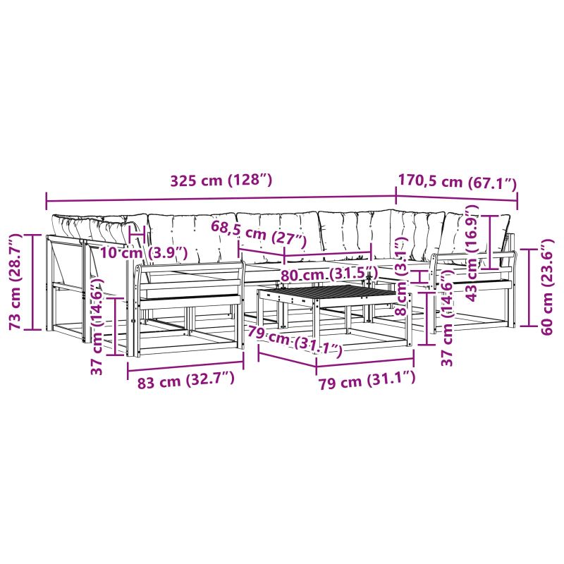 Този комплект за градински мебели комбинира стил и функция, създавайки впечатляваща част за всяка градина или тераса. Модерният му дизайн с изчистени линии и минималистичен вид внася елегантност, идеална за релаксиращи моменти и социални събирания. Изработен напълно от масивна акациева дървесина, комплектът осигурява дълготрайност и визуална привлекателност - перфектен за тези, които искат стил без компромиси с практичността. Издръжлив масивен акациев дървен конструкция: Изработен от масивно акациево дърво, този комплект мебели за открито е устойчив на всякакви метеорологични условия. Здравата му конструкция гарантира сигурност и дълготрайност, а топлият естествен цвят се вписва идеално в градината или на терасата. Устойчивост на времето: С лакирана повърхност, комплектът предлага защита от слънце и дъжд, запазвайки както външния си вид, така и функционалността дълго време. Компоненти и дизайн: Всяка част от комплекта - от подлакътниците до облегалките, е проектирана за стил и практичност. Поддържащите функции предлагат допълнителен комфорт, а съгласуваният дизайн гарантира естетичен вид, подходящ за всякакви поводи. Комфорт и разнообразие: С модулна структура, комплектът е супер гъвкав, идеален за тераси, открити събития или приятни моменти на четене. Лесно се настройва за максимален уют и удобство. Лесна поддръжка и грижа: За да запазиш мебелите в добро състояние, просто ги почиствай с влажна кърпа, без да използваш остри препарати. Редовната грижа запазва външния вид и увеличава срока на ползване.