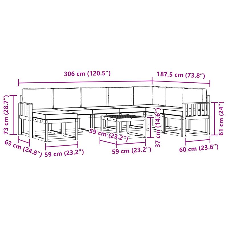 Този комплект за секционно канапе е създаден, за да внесе съвременен стил в градината, патиото или зона около басейна. Направен е от масивна акациева дървесина и има топъл кафяв цвят, който добре се съчетава с зеленината на открито. Може да бъде използван самостоятелно или като част от по-голямо оформление, а чистите му линии и структурирано оформление му придават елегантен вид, който е както приветлив, така и практичен. Проектиран е за най-доброто изживяване при релаксация и социализиране, предоставя удобно решение за сядане, което лесно се вписва в различни открити теми. Масивна акациева дървесина: Този комплект секционни канапета е изработен от висококачествена акациева дървесина, която е устойчива на мухъл и насекоми, идеална за външна употреба. Тя запазва елегантния си вид, независимо от времето. Модулна многофункционалност: Модулният дизайн позволява различни конфигурации, за да отговаря на вашите нужди. Всеки модул може лесно да бъде пренареден, независимо дали искате уединено местенце или място за много гости. Персонализацията е бърза и лесна! Решетъчна облегалка: Решетъчната облегалка не е само стилна, но и помага за въздушната циркулация, поддържайки ви хладни през лятото. Ергономичният дизайн прави сядането удобно, а линиите придават съвременен вид. Интегрирани под rests: Оснащен с удобни под rests от акациева дървесина, идеални за поставяне на напитки и малки вещи. Тази практичност увеличава удобството, правейки го перфектен избор за спокойни открити места. Лесна поддръжка: Предоставя минимална поддръжка - просто изтривайте с влажна кърпа и използвайте покривала, когато не е в употреба. По този начин ще запазите канапето в добро състояние за дълго време.