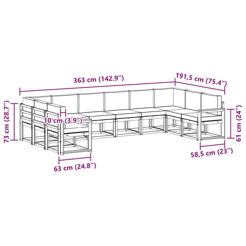 Този секционен диван за открито додава модерен шик на вашата патия или градина с чист дизайн, вдъхновен от простотата и функционалността. Умело изработен от солидна акациева дървесина, стилната рамка е допълнена от решетъчно гръбче и топли кафяви тонове, които перфектно се вписват в откритите пространства. Създаден за комфорт и универсалност, този комплект предлага приятно място за отмора или забавление на гости. Наслаждавайте се на алфреско изживяване с поглед към басейна или си създайте уютно място в задния двор с този гъвкав диван. Солидна акациева дървесина: Конструкцията на този диван е направена от здрава акациева дървесина, известна с дълготрайността си и устойчивостта на различни метеорологични условия, осигурявайки дългогодишна употреба на открито. Всяка част има топъл кафяв оттенък, който подчертава естествената му красота и добавя уют на вашето градинско пространство. Модулен дизайн: Модулната схема позволява гъвкава пренастройка, за да отговори на различни предпочитания за сядане, идеално за персонализиране спрямо броя на гостите и вида на събитието. Организирайте го в зона за релакс или уютен ъгъл за интимни събирания. Решетъчен гръб: С решетъчен гръб, направен от същата здрава акациева дървесина, този дизайн предлага каквото и новия стил и подобрява циркулацията на въздуха, така че да останете хладни и комфортни дори в горещите дни. Функционални подлакътници: Релаксацията е подобрена с добре проектирани подлакътници, осигуряващи ергономична поддръжка. Тази стабилна конструкция предлага удобно място за отдих, особено при дълга употреба. Грижа и поддръжка: Поддържайте първоначалния вид на комплекта с минимални усилия. Просто избърсвайте повърхностите с влажна кърпа и използвайте защитни покрития, когато не го ползвате, за да избегнете повреди от слънце и лошо време.