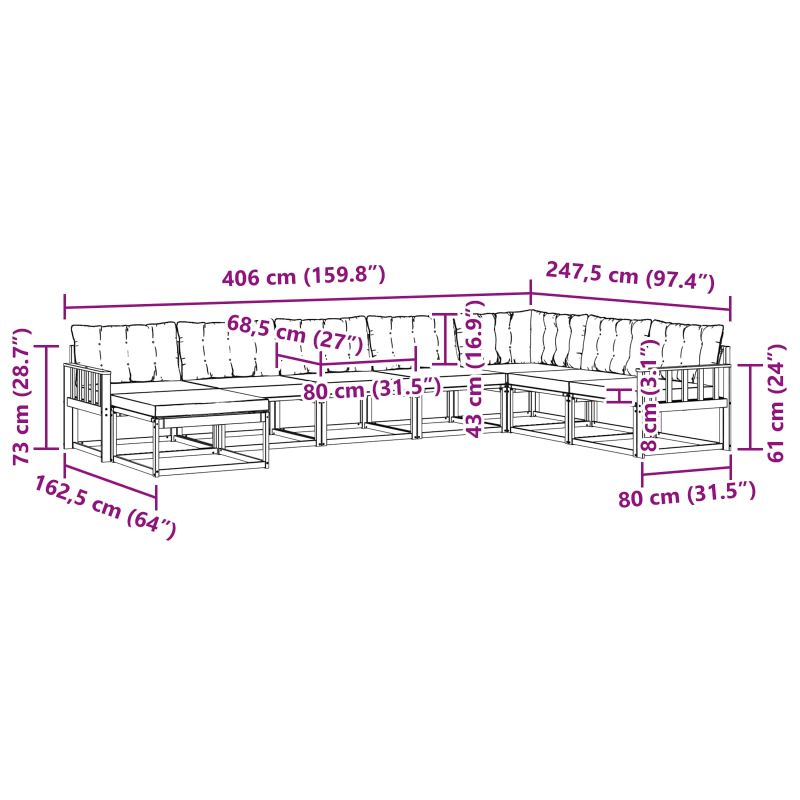 Този модерен комплект дивани е от солидно акациево дърво, което съчетава здравина, комфорт и стил - точно за градини и тераси. Съвременният дизайн перфектно се комбинира с естествената текстура на дървото, създавайки приятно местенце за разговори или релакс на открито. Премиум материали: Изграден от здраво солидно акациево дърво, комплектът показва отлична изработка, устойчива на елементи. Естествената устойчивост на дървото, съчетана с Textilene, гарантира дълготрайност и малко поддръжка, жертвайки стил за издръжливост при почивка навън. Включени компоненти: Издръжливата рамка е с текстилни материали за седалките и гърбовете, които дават текстура и поддръжка. Наслади се на удобството на дебелите акациеви подлакътници, които допринасят за дизайна и комфорта. Тези практични възглавници за открито с пяна и сваляеми покрития ще осигурят допълнителен комфорт на всяко място за сядане. Функционални характеристики: Проектиран да устоява на избледняване и да е лесен за почистване, удобният дизайн на облегалката осигурява дълготрайност по време на дълъг престой навън. Практичните ръкохватки поддържат естествени пози, подобрявайки уютната атмосфера за незабравими моменти навън. Препоръчителни употреби: От неформални градински места до празнични терасни партита, комплектът предлага перфектен фон за лични срещи на открито. Неговата ненатрапчива елегантност носи атмосфера, която се адаптира както към спокойни семейни вечери, така и към весели социални събития. Поддръжка и грижа: Запази този впечатляващ комплект с прости рутинни процедури. Редовно бъркай повърхностите с влажна кърпа, за да отстраниш остатъци от навън и така да запазиш яркостта и дълготрайността на мебелите за открито.