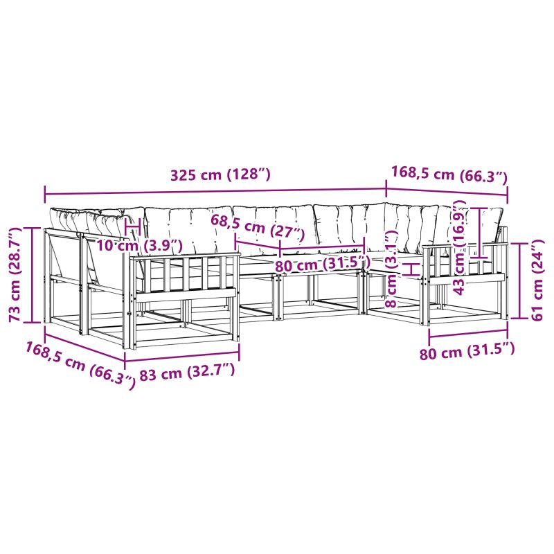 Сетът за градински мебели предлага стил и функционалност, създавайки централна точка за всяка градина или тераса. Съвременният му дизайн е определен от чисти линии и минималистични елементи, което внася елегантност и функционалност, за да се наслаждавате на времето на открито. Направен е от масивна акациева дървесина, така че е издръжлив и привлекателен, идеален за хора, които търсят практичност, но и стил в градинските си мебели. Издръжлива масивна акациева дървесина: Подходяща за външно ползване, този сет е изработен от акациева дървесина, известна със своята здравина и устойчивост на климатични условия. Здравата конструкция осигурява стабилност, а топлият естествен тон прекрасно подхожда на всяка градина или тераса. n Защитен дизайн: Лакираната повърхност предлага допълнителна защита от слънце, дъжд и други условия. Полираното покритие помага да се запази здрав вид и функционалност, осигурявайки дълготрайност за вашата градина, тераса или заден двор. n Компоненти и стил: Всеки елемент, от подлакътниците до облегалките, е проектиран за стил и комфорт. Функционалните детайли увеличават удобството, докато общият дизайн гарантира визуална хармония, която е подходяща за различни поводи на открито. n Комфорт и гъвкавост: Модулният дизайн позволява адаптиране на конфигурацията според различни пространства и нужди. Идеален за почивка, социализиране или спокойно четене, този комплект лесно се вписва във всяка външна среда, оптимизирайки комфорта и функционалността. n Прости указания за поддръжка: За да запазите мебелите в добро състояние, просто ги почиствайте с влажна кърпа и избягвайте агресивни почистващи препарати. Редовната поддръжка помага да запазите външния вид и удължава живота на мебелите.