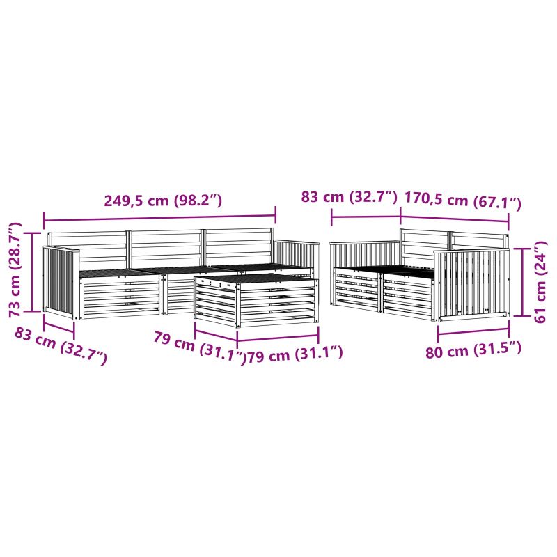 Този комплект мебели за открито свързва стил и функционалност, създавайки впечатляващ фокус в градината или на терасата. С модерния си дизайн, изчистени линии и минимални детайли, добавя елегантност и удобство за открито. Изработен от масивно акациево дърво, този комплект е много здрав и ще изглежда добре дълго време – идеален избор за тези, които търсят практични решения и изтънчен стил. Издръжливо акациево дърво: Комплектът е направен от истинско акациево дърво и е известен с дълговечността и устойчивостта си на атмосферни условия. Солидната конструкция осигурява надеждност и стабилност, докато топлият естествен цвят добавя красота на всяко градинско или терасово пространство. Устойчив на времето: Лакираната повърхност осигурява допълнителен слой защита срещу слънце и дъжд. Полираното покритие запазва добрия вид и функционалността, като осигурява дълготрайност за градината, терасата или задния двор. Компоненти и дизайн: Всеки елемент, от подлакътниците до облегалките, е проектиран с внимание към стила и функционалността. Поддръжката осигурява допълнителен комфорт и съвместният дизайн гарантира визуална хармония за различни открити събития. Комфорт и многофункционалност: Модулният дизайн позволява лесна промяна на конфигурацията, за да отговаря на различни нужди. Идеален е за отдих, социални събития или четене на тиха книга, този комплект лесно се адаптира към всяка открита среда и увеличава комфорта. Лесна поддръжка: За да поддържате мебелите в добро състояние, просто ги изтрийте с влажна кърпа и избягвайте агресивни почистващи средства. Редовната грижа помага за запазването на добрия им вид и удължава живота на мебелите.