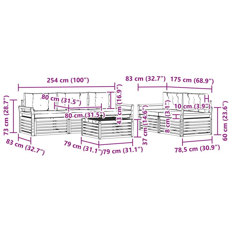 Този комплект мебели за открито свързва стил и функционалност, създавайки впечатляващ фокус в градината или на терасата. С модерния си дизайн, изчистени линии и минимални детайли, добавя елегантност и удобство за открито. Изработен от масивно акациево дърво, този комплект е много здрав и ще изглежда добре дълго време – идеален избор за тези, които търсят практични решения и изтънчен стил. Издръжливо акациево дърво: Комплектът е направен от истинско акациево дърво и е известен с дълговечността и устойчивостта си на атмосферни условия. Солидната конструкция осигурява надеждност и стабилност, докато топлият естествен цвят добавя красота на всяко градинско или терасово пространство. Устойчив на времето: Лакираната повърхност осигурява допълнителен слой защита срещу слънце и дъжд. Полираното покритие запазва добрия вид и функционалността, като осигурява дълготрайност за градината, терасата или задния двор. Компоненти и дизайн: Всеки елемент, от подлакътниците до облегалките, е проектиран с внимание към стила и функционалността. Поддръжката осигурява допълнителен комфорт и съвместният дизайн гарантира визуална хармония за различни открити събития. Комфорт и многофункционалност: Модулният дизайн позволява лесна промяна на конфигурацията, за да отговаря на различни нужди. Идеален е за отдих, социални събития или четене на тиха книга, този комплект лесно се адаптира към всяка открита среда и увеличава комфорта. Лесна поддръжка: За да поддържате мебелите в добро състояние, просто ги изтрийте с влажна кърпа и избягвайте агресивни почистващи средства. Редовната грижа помага за запазването на добрия им вид и удължава живота на мебелите.