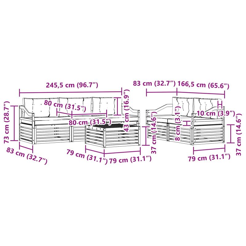 Този комплект мебели за открито свързва стил и функционалност, създавайки впечатляващ фокус в градината или на терасата. С модерния си дизайн, изчистени линии и минимални детайли, добавя елегантност и удобство за открито. Изработен от масивно акациево дърво, този комплект е много здрав и ще изглежда добре дълго време – идеален избор за тези, които търсят практични решения и изтънчен стил. Издръжливо акациево дърво: Комплектът е направен от истинско акациево дърво и е известен с дълговечността и устойчивостта си на атмосферни условия. Солидната конструкция осигурява надеждност и стабилност, докато топлият естествен цвят добавя красота на всяко градинско или терасово пространство. Устойчив на времето: Лакираната повърхност осигурява допълнителен слой защита срещу слънце и дъжд. Полираното покритие запазва добрия вид и функционалността, като осигурява дълготрайност за градината, терасата или задния двор. Компоненти и дизайн: Всеки елемент, от подлакътниците до облегалките, е проектиран с внимание към стила и функционалността. Поддръжката осигурява допълнителен комфорт и съвместният дизайн гарантира визуална хармония за различни открити събития. Комфорт и многофункционалност: Модулният дизайн позволява лесна промяна на конфигурацията, за да отговаря на различни нужди. Идеален е за отдих, социални събития или четене на тиха книга, този комплект лесно се адаптира към всяка открита среда и увеличава комфорта. Лесна поддръжка: За да поддържате мебелите в добро състояние, просто ги изтрийте с влажна кърпа и избягвайте агресивни почистващи средства. Редовната грижа помага за запазването на добрия им вид и удължава живота на мебелите.