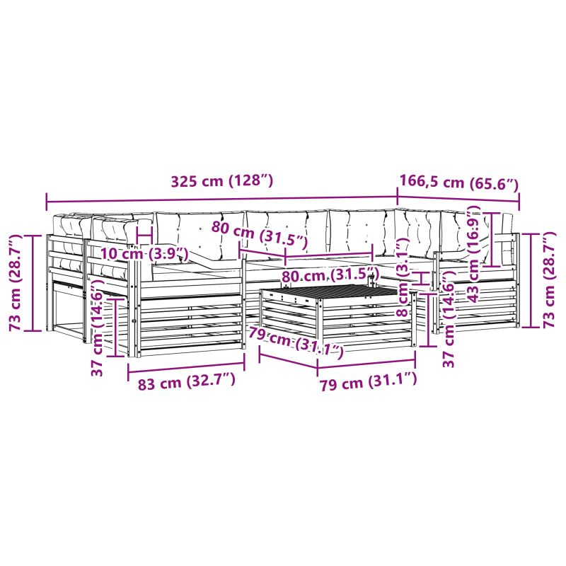 • 4 x Среден диван: 79 x 83 x 73 см (ДxШxВ),2 x Ъглов диван: 83 x 83 x 73 см (ДxШxВ)