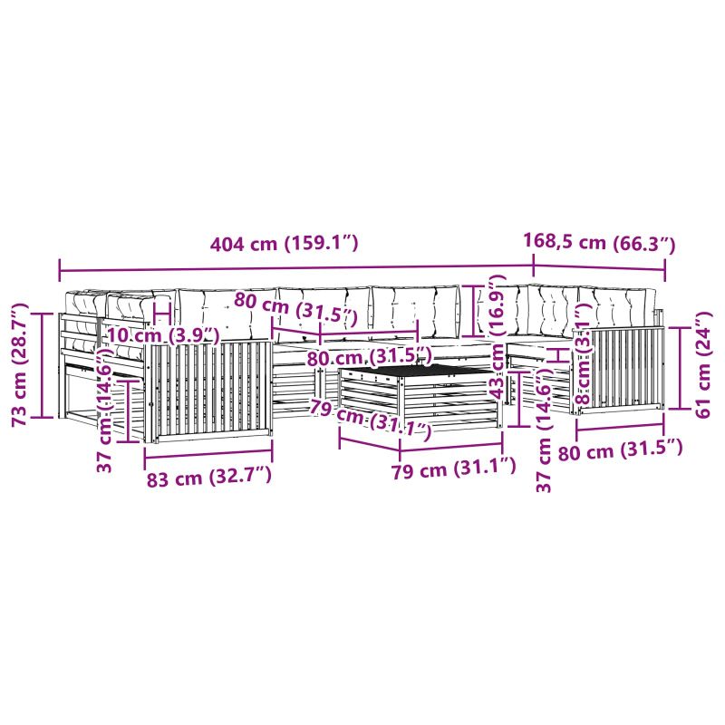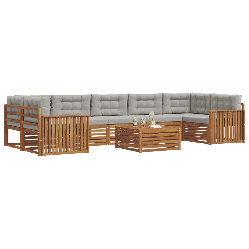 Този комплект мебели за открито е съчетание от стил и функционалност, което оформя централна част за всяка градина или тераса. Модерният дизайн с чисти линии добавя елегантност и осигурява практичност за социални събирания. Издръжлива масивна акациева дървесина: Здравата му структура осигурява дълготрайност и устойчивост на външни условия, а топлата му визия придава charme на всяка градина или тераса. Устойчивост на атмосферни влияния: Лакираната повърхност добавя защита от слънце и дъжд, запазвайки както вида, така и функциите на комплекта за дълго.