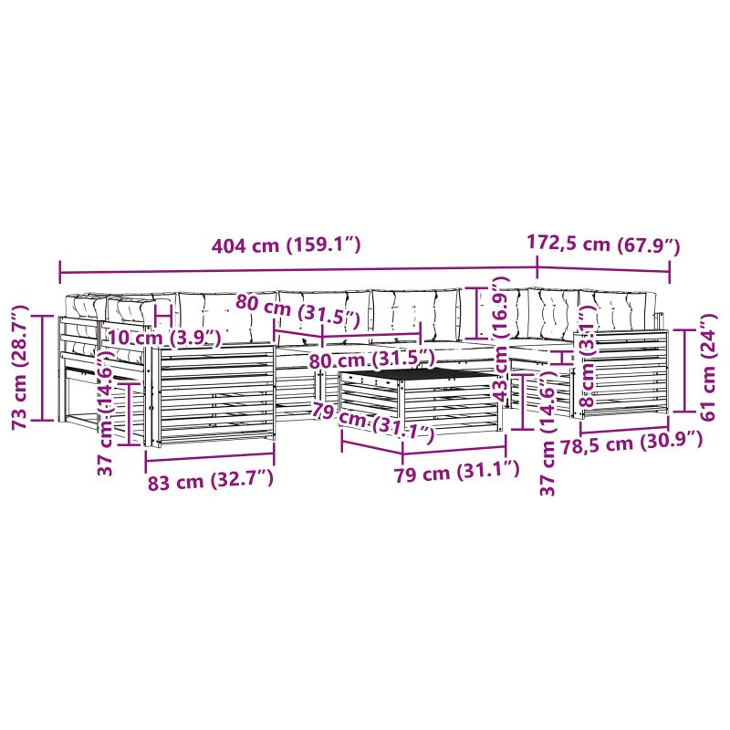 • 5 x Среден диван: 79 x 83 x 73 см (Д x Ш x В),2 x Ъглов диван: 83 x 83 x 73 см (Д x Ш x В)