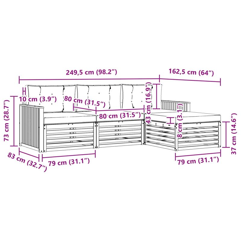 Комплектът градински мебели съчетава стил и функционалност, създавайки важен акцент за всяка градина или тераса. С модерен дизайн, чисти линии и минимални детайли, той добавя елегантност, докато е перфектен за открито. Изработен от качествена акациева дървесина, комплектът предлага дълготрайност и привлекателен вид, идеален избор за тези, които искат практични и красиви градински мебели. Издръжлива масивна акациева дървесина: Комплектът градински мебели е изработен от масивна акациева дървесина, известна със своята издръжливост. Топлият естествен цвят подчертава всяка градина или тераса. Устойчив на времето дизайн: Лакираната повърхност предлага защита срещу слънце и дъжд, което помага за запазване на външния вид и функционалността. Компоненти и дизайн: Проектиран е с внимание към детайла, за да осигури комфорт и стил. Визуално е балансиран и допълва различни поводи за открито. Комфорт и многофункционалност: Модулният дизайн позволява различни конфигурации, идеален за всякакви социални събития или уединени мигове на релакс. Лесна поддръжка: Поддържайте мебелите чисти с влажна кърпа и избягвайте агресивни почистващи препарати. Редовната поддръжка удължава живота им.