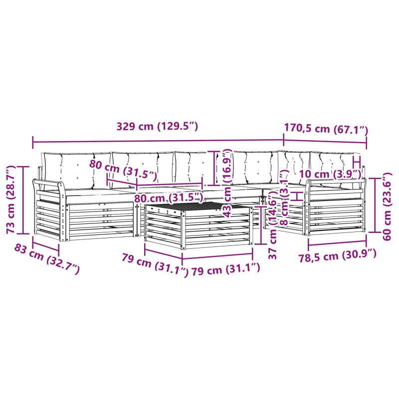 Комплектът градински мебели обединява стил и функция, създавайки впечатляващ акцент в градината или на терасата. Със съвременния си дизайн, определен от чисти линии и простички детайли, добавя елегантност и е идеален за отдих и социални срещи. Направен е от масивна акациева дървесина, което гарантира издръжливост и дълготрайна привлекателност, правейки го чудесен избор за тези, които търсят практичност и стил в градинската мебелировка. Издръжливо масивно акациево дърво: Изработен от плътна акациева дървесина, този комплект е снабден със здравина и устойчивост на външната среда. Здравата конструкция предлага надеждност и дълготрайна стабилност, а топлият естествен тон добавя допълнителен чар на всяка градина или тераса. Дизайн, устойчив на времето: Този комплект мебели за открито има лакирана повърхност, която осигурява допълнителна защита от слънце, дъжд и всякакви метеорологични условия. Полираното покритие помага за запазване на външния вид и функцията, осигурявайки дълготрайна издръжливост за вашата градина, тераса или двор. Компоненти и дизайн: Всеки елемент, от подлакътниците до облегалките, е създаден с внимание към стил и комфорт. Подпорният дизайн предоставя допълнителна удобност, а сплотеният вид осигурява визуално хармонично усещане, подходящо за различни поводи на открито. Комфорт и гъвкавост: Модулният дизайн позволява различни настройки, подходящи за разнообразни пространства и нужди. Идеален е за релаксация, социални събирания или спокойно четене; комплектът лесно се адаптира към всяка открита среда, като оптимизира комфорта и практичността. Лесна поддръжка: За да поддържате мебелите в добро състояние, просто ги почиствайте с мокра кърпа и избягвайте агресивни почистващи средства. Редовната грижа спомага за запазване на външния вид и удължава живота на мебелите.
