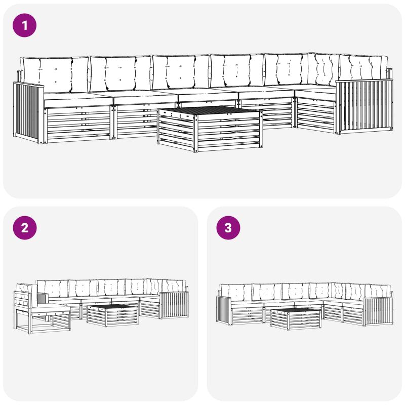 Комплектът за външна мебел съчетава стил и практичност, създавайки зашеметяващ акцент за всяка градина или тераса. Неговият модерен дизайн, в стил „минимализъм“, добавя елегантност, като същевременно осигурява комфорт за релаксиращи мигове или социални събития. Направен изцяло от масивна акация, комплектът предлага отлична издръжливост и дълготрайна визия, което го прави идеален за тези, които търсят баланс между комфорт и елегантност в мебелите за открито. Издръжлива масивна акация: Направен от масивна акация, този комплект за външни мебели е устойчив на неподходящи условия. Стойката предоставя стабилност, а топлият природен тон обогатява всяка градина или тераса. Устойчив на атмосферни условия: С лакирана повърхност, която защитава от слънце и дъжд, комплектът запазва визията и функционалността, осигурявайки дълготрайна употреба в градината. Компоненти и дизайн: Всеки елемент, от възглавниците до гръбчетата, е проектиран с вкус и функционалност. Поддържащите функции предлагат комфорт, докато целият дизайн е визуално приятен и подходящ за всеки случай на открито. Комфорт и многофункционалност: Модулният дизайн позволява различни конфигурации, отговарящи на нуждите на пространството. Перфектен за релаксация, приятелски събирания или просто четене, комплектът се адаптира лесно към всяко открито пространство, повишавайки комфорта и полезността. Лесна поддръжка: За да поддържате мебелите в добро състояние, просто избърсвайте повърхността с влажна кърпа, избягвайте остри почистващи средства. Редовната грижа запазва вида на мебелите за по-дълго.