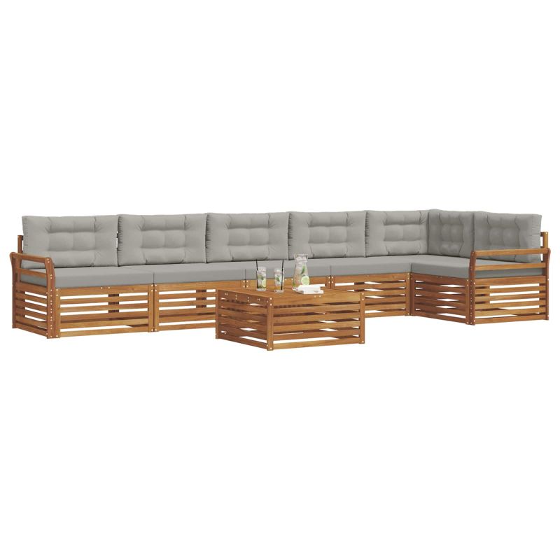 Комплектът за външна мебел съчетава стил и практичност, създавайки зашеметяващ акцент за всяка градина или тераса. Неговият модерен дизайн, в стил „минимализъм“, добавя елегантност, като същевременно осигурява комфорт за релаксиращи мигове или социални събития. Направен изцяло от масивна акация, комплектът предлага отлична издръжливост и дълготрайна визия, което го прави идеален за тези, които търсят баланс между комфорт и елегантност в мебелите за открито. Издръжлива масивна акация: Направен от масивна акация, този комплект за външни мебели е устойчив на неподходящи условия. Стойката предоставя стабилност, а топлият природен тон обогатява всяка градина или тераса. Устойчив на атмосферни условия: С лакирана повърхност, която защитава от слънце и дъжд, комплектът запазва визията и функционалността, осигурявайки дълготрайна употреба в градината. Компоненти и дизайн: Всеки елемент, от възглавниците до гръбчетата, е проектиран с вкус и функционалност. Поддържащите функции предлагат комфорт, докато целият дизайн е визуално приятен и подходящ за всеки случай на открито. Комфорт и многофункционалност: Модулният дизайн позволява различни конфигурации, отговарящи на нуждите на пространството. Перфектен за релаксация, приятелски събирания или просто четене, комплектът се адаптира лесно към всяко открито пространство, повишавайки комфорта и полезността. Лесна поддръжка: За да поддържате мебелите в добро състояние, просто избърсвайте повърхността с влажна кърпа, избягвайте остри почистващи средства. Редовната грижа запазва вида на мебелите за по-дълго.