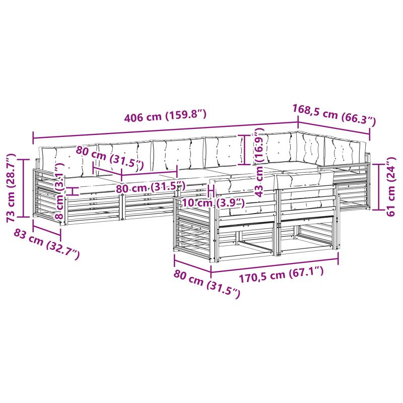Този комплект градински дивани е перфектен, комбиниращ модерна елегантност с комфорт. Дизайнът му е страхотен за всяко място в градината или на терасата. Със своя изчистен стил и богата цветова палитра от акациева дървесина, той е идеален за отдих на открито. Сглобяемият му дизайн предлага много опции за организиране на пространството за релаксация, развлечения или неформални разговори. Всеки елемент не само ще подобри атмосферата на вашата градина, но и ще осигури уютно място за срещи с приятели или спокойни мигове на уединение. Масивни материали: Комплектът е изработен от масивна акациева дървесина, осигуряваща стабилност и дълготрайност за употреба навън. Текстурата и топлите тонове на дървесината добавят естествена красота, която подхожда на всякаква среда. Този материал гарантира надеждност и дълъг живот, тъй като акацията е устойчива на атмосферни влияния и запазва цвета и визията си с времето. Функция и дизайн: Модулната структура на дивана позволява пренастройка, за да се вписва в конкретните ви нужди. Решетъчният гръб осигурява удобно облегнато положение и добра циркулация на въздуха, критично важна за горещите дни. Ергономичните подлакътници осигуряват комфортно сядане, което е удобно дори при продължителни периоди на открито. Многофункционални компоненти: С фиксирана рамка, този елемент е устойчив на често ползване. Топлите подлакътници и гръбчета подобряват комфорта, а модулният дизайн позволява разширени възможности за употреба, идеален за слънчеви градини и оживени тераси. Модерна адаптивност: Стилен с минималистичен подход, комплектът подчертава чистите линии. Подходящ е за съвременни открити пространства и отговаря на функционалните и естетически нужди, предлагайки възможност за уютно прекарване на времето с приятели или за индивидуален отдих. Лесна поддръжка: За да запазите отличния вид на комплекта, просто го избършете с влажна кърпа. Тази проста поддръжка осигурява, че комплектът винаги изглежда приветливо, дори при интензивно използване или сезонни промени.