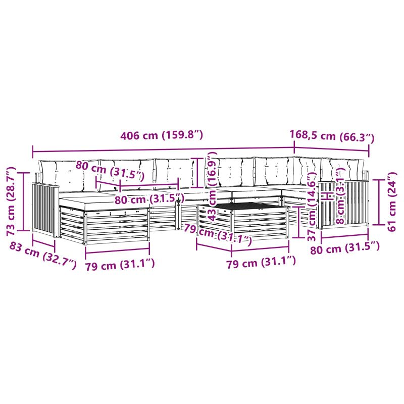 Този секционен диван е стилен и универсален, идеален за преобразуване на вашата градина или патио в удобно място. С модерен вид и чисти линии, той се интегрира безпроблемно в откритите пространства и е перфектен за релаксация. Комбинира естествени дървесни тонове с здраво строителство, служейки и като красиво решение за сядане. Качество на изработката: Изработен от масивна акациева дървесина, този комплект е с богат кафяв цвят, излъчващ елегантност и топлина. Висококачественият материал е здрав и е устойчив на климатични влияния, което го прави идеален за дългосрочна употреба на открито. Вградена гъвкавост: Модулният дизайн позволява адаптиране на компонентите спрямо пространството или повода. Подходящ е както за големи събирания, така и за уютни вечери. Стил и практичност: С решетъчен гръб и минималистични подпори, диванът предлага баланс между стил и лесна поддръжка. Допълващи компоненти: Изработен е с решетъчни гръбове и здрави подпори от масивна акациева дървесина, предпазващи елегантността му. Грижи и поддръжка: Сетът изисква само забърсване с влажна кърпа за поддържане на вида си и гарантира дълготрайност.