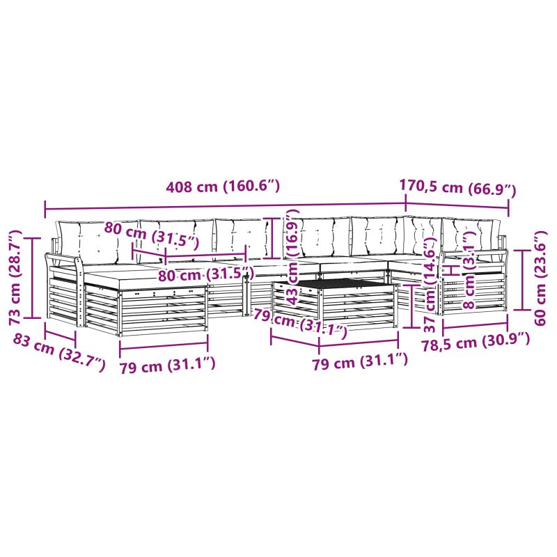 Този секционен диван е стилен и универсален, идеален за преобразуване на вашата градина или патио в удобно място. С модерен вид и чисти линии, той се интегрира безпроблемно в откритите пространства и е перфектен за релаксация. Комбинира естествени дървесни тонове с здраво строителство, служейки и като красиво решение за сядане. Качество на изработката: Изработен от масивна акациева дървесина, този комплект е с богат кафяв цвят, излъчващ елегантност и топлина. Висококачественият материал е здрав и е устойчив на климатични влияния, което го прави идеален за дългосрочна употреба на открито. Вградена гъвкавост: Модулният дизайн позволява адаптиране на компонентите спрямо пространството или повода. Подходящ е както за големи събирания, така и за уютни вечери. Стил и практичност: С решетъчен гръб и минималистични подпори, диванът предлага баланс между стил и лесна поддръжка. Допълващи компоненти: Изработен е с решетъчни гръбове и здрави подпори от масивна акациева дървесина, предпазващи елегантността му. Грижи и поддръжка: Сетът изисква само забърсване с влажна кърпа за поддържане на вида си и гарантира дълготрайност.