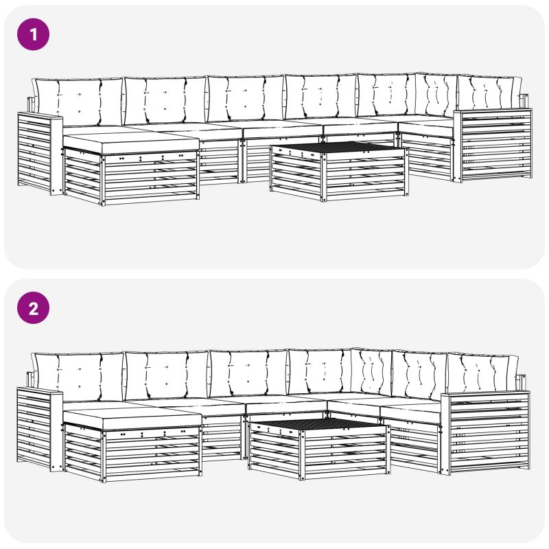 Този секционен диван е стилен и универсален, идеален за преобразуване на вашата градина или патио в удобно място. С модерен вид и чисти линии, той се интегрира безпроблемно в откритите пространства и е перфектен за релаксация. Комбинира естествени дървесни тонове с здраво строителство, служейки и като красиво решение за сядане. Качество на изработката: Изработен от масивна акациева дървесина, този комплект е с богат кафяв цвят, излъчващ елегантност и топлина. Висококачественият материал е здрав и е устойчив на климатични влияния, което го прави идеален за дългосрочна употреба на открито. Вградена гъвкавост: Модулният дизайн позволява адаптиране на компонентите спрямо пространството или повода. Подходящ е както за големи събирания, така и за уютни вечери. Стил и практичност: С решетъчен гръб и минималистични подпори, диванът предлага баланс между стил и лесна поддръжка. Допълващи компоненти: Изработен е с решетъчни гръбове и здрави подпори от масивна акациева дървесина, предпазващи елегантността му. Грижи и поддръжка: Сетът изисква само забърсване с влажна кърпа за поддържане на вида си и гарантира дълготрайност.