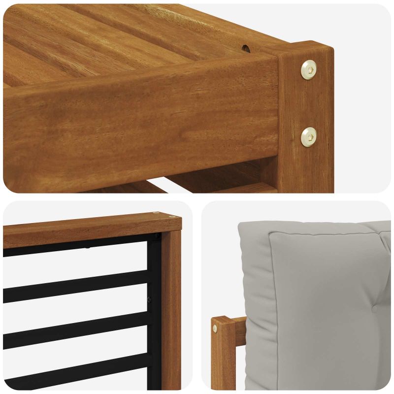 Този секционен диван е стилен и универсален, идеален за преобразуване на вашата градина или патио в удобно място. С модерен вид и чисти линии, той се интегрира безпроблемно в откритите пространства и е перфектен за релаксация. Комбинира естествени дървесни тонове с здраво строителство, служейки и като красиво решение за сядане. Качество на изработката: Изработен от масивна акациева дървесина, този комплект е с богат кафяв цвят, излъчващ елегантност и топлина. Висококачественият материал е здрав и е устойчив на климатични влияния, което го прави идеален за дългосрочна употреба на открито. Вградена гъвкавост: Модулният дизайн позволява адаптиране на компонентите спрямо пространството или повода. Подходящ е както за големи събирания, така и за уютни вечери. Стил и практичност: С решетъчен гръб и минималистични подпори, диванът предлага баланс между стил и лесна поддръжка. Допълващи компоненти: Изработен е с решетъчни гръбове и здрави подпори от масивна акациева дървесина, предпазващи елегантността му. Грижи и поддръжка: Сетът изисква само забърсване с влажна кърпа за поддържане на вида си и гарантира дълготрайност.