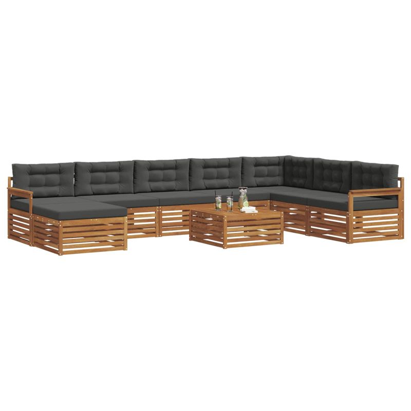 Този комплект ъглови дивани е създаден, за да подобри всяка градина или двор. С модерен стил и изчистени линии, той е подходящ за релаксация или събиране с приятели. Кафявият цвят му придава естествен вид и лесно се вписва с околната природа, предлагащ достатъчно място за сядане на семейството и приятелите. Материали: Направен е от масивно акациево дърво, което гарантира здравина и красиво естествено покритие. Текстурата му е плътна и приятна, а натуралните масла предпазват от насекоми, осигурявайки дълготрайност. Модерен дизайн: С изчистени линии и минималистичен стил, той е идеален за съвременни открити пространства. Кафявият цвят се съчетава с зеленината на градината, правейки го семпъл и изискан. Модулната конструкция позволява различни подредби според пространството и нуждите. Комфорт: Масивната акациева дървесина в комбинация с 100% полиестерни възглавници осигурява уютна повърхност для релакс. Тъканта е не само мека, но и устойчива, така че да ти бъде удобно навън. Ергономичен дизайн: С гръб, изработен от ламели и стабилни подлакътници, комплектът е много удобен. Те осигуряват допълнителна опора при дълги часове на отпускане. Лесна поддръжка: Поддържай диваните свежи с прости стъпки – само ги избърсвай с влажна кърпа, за да премахнеш прах и мръсотия. Осигурява дълготрайна красота без трудности.