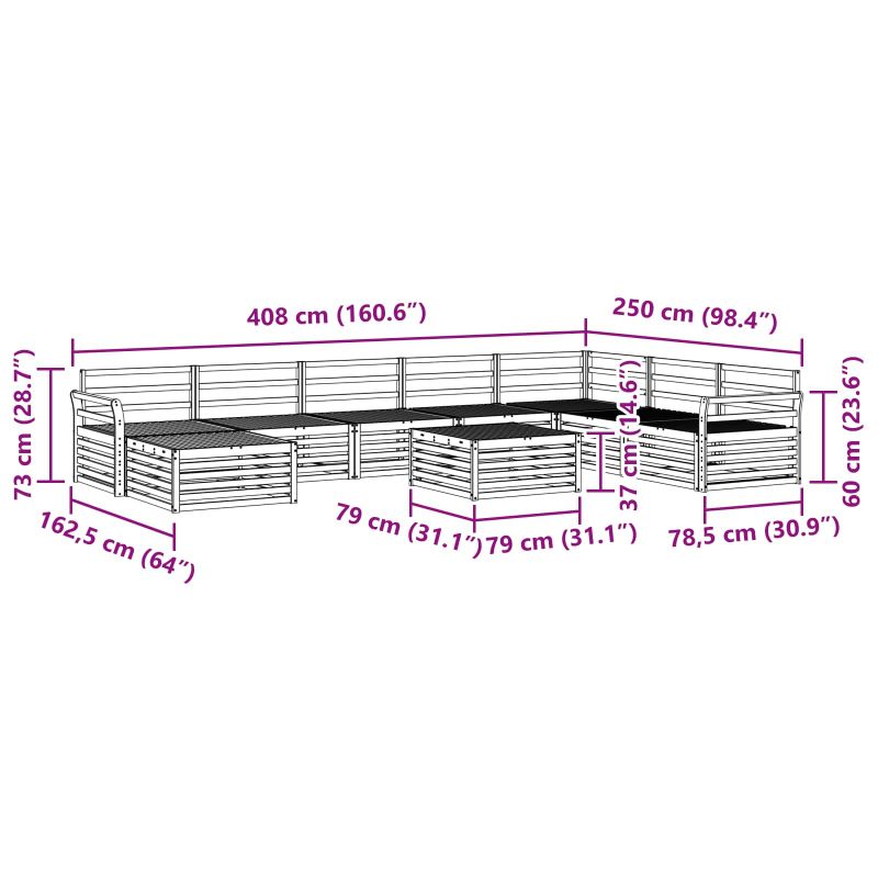 Този комплект ъглови дивани е създаден, за да подобри всяка градина или двор. С модерен стил и изчистени линии, той е подходящ за релаксация или събиране с приятели. Кафявият цвят му придава естествен вид и лесно се вписва с околната природа, предлагащ достатъчно място за сядане на семейството и приятелите. Материали: Направен е от масивно акациево дърво, което гарантира здравина и красиво естествено покритие. Текстурата му е плътна и приятна, а натуралните масла предпазват от насекоми, осигурявайки дълготрайност. Модерен дизайн: С изчистени линии и минималистичен стил, той е идеален за съвременни открити пространства. Кафявият цвят се съчетава с зеленината на градината, правейки го семпъл и изискан. Модулната конструкция позволява различни подредби според пространството и нуждите. Комфорт: Масивната акациева дървесина в комбинация с 100% полиестерни възглавници осигурява уютна повърхност для релакс. Тъканта е не само мека, но и устойчива, така че да ти бъде удобно навън. Ергономичен дизайн: С гръб, изработен от ламели и стабилни подлакътници, комплектът е много удобен. Те осигуряват допълнителна опора при дълги часове на отпускане. Лесна поддръжка: Поддържай диваните свежи с прости стъпки – само ги избърсвай с влажна кърпа, за да премахнеш прах и мръсотия. Осигурява дълготрайна красота без трудности.