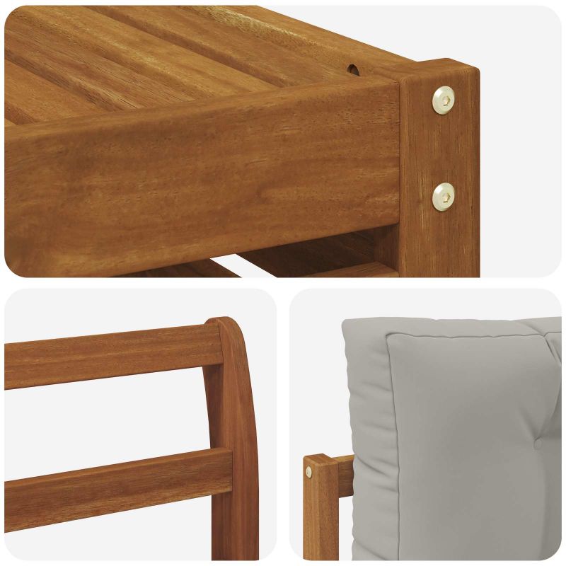 Този комплект ъглови дивани е създаден, за да подобри всяка градина или двор. С модерен стил и изчистени линии, той е подходящ за релаксация или събиране с приятели. Кафявият цвят му придава естествен вид и лесно се вписва с околната природа, предлагащ достатъчно място за сядане на семейството и приятелите. Материали: Направен е от масивно акациево дърво, което гарантира здравина и красиво естествено покритие. Текстурата му е плътна и приятна, а натуралните масла предпазват от насекоми, осигурявайки дълготрайност. Модерен дизайн: С изчистени линии и минималистичен стил, той е идеален за съвременни открити пространства. Кафявият цвят се съчетава с зеленината на градината, правейки го семпъл и изискан. Модулната конструкция позволява различни подредби според пространството и нуждите. Комфорт: Масивната акациева дървесина в комбинация с 100% полиестерни възглавници осигурява уютна повърхност для релакс. Тъканта е не само мека, но и устойчива, така че да ти бъде удобно навън. Ергономичен дизайн: С гръб, изработен от ламели и стабилни подлакътници, комплектът е много удобен. Те осигуряват допълнителна опора при дълги часове на отпускане. Лесна поддръжка: Поддържай диваните свежи с прости стъпки – само ги избърсвай с влажна кърпа, за да премахнеш прах и мръсотия. Осигурява дълготрайна красота без трудности.