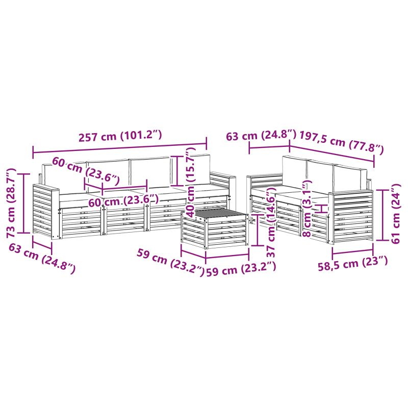 Комплектът за открито съчетава стил и практичност, добавяйки динамика на всяка градина или тереса. Неговият модерен дизайн с изчистени линии и минималистични детайли внася елегантност, докато предоставя комфорт за социални събирания на открито. Направен е изцяло от масивно акациево дърво, което гарантира дълготрайност и приятно визуално въздействие – идеален избор за онези, които търсят нещо практично и стилно. Издръжлива масивна акациева дървесина: Направен от масивно акациево дърво, този комплект е стабилен и устойчив на открито. Здравата конструкция осигурява надеждна опора и дълготрайност, а топлият тон обогатява всяка градина или тереса. Устойчив на времето дизайн: Лакираната повърхност предлага допълнителна защита от слънце и дъжд. Лъскавото покритие запазва външния вид и осигурява дълготрайна устойчивост за вашата градина, тераса или двор. Компоненти и дизайн: Всеки елемент е проектиран за стил и комфорт. Допълнителните характеристики внасят уют, а съвместимият дизайн създава визуално привлекателен ансамбъл. Комфорт и многообразие: Модулният дизайн позволява адаптация към различни пространства. Идеален е за почивка, социални събирания или четене на свеж въздух – визуално обогатява всяка открита среда. Лесна поддръжка и сглобяване: Чистенето с влажна кърпа е лесно, а изборът на меки почистващи средства е препоръчителен. Редовната грижа запазва привлекателния вид на мебелите.