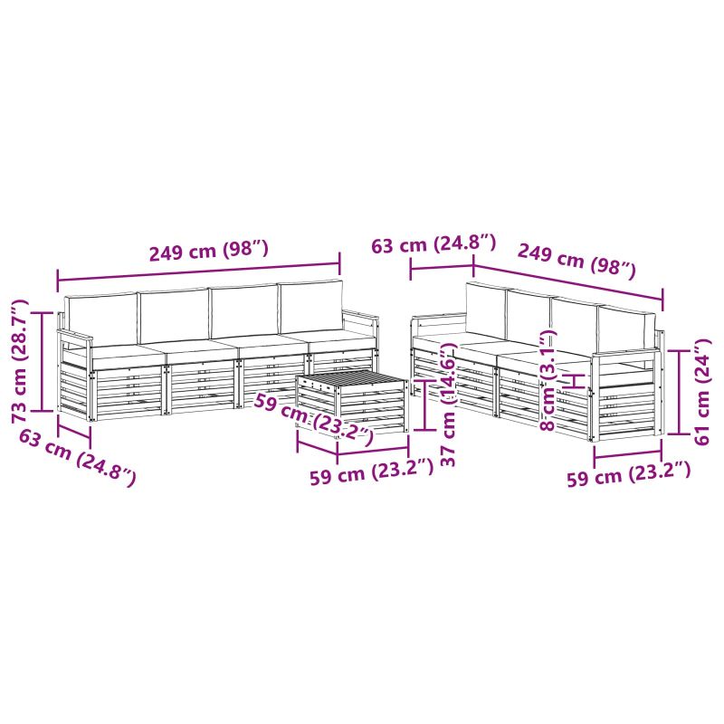 Комплектът градински мебели съчетава стил и функция, създавайки акцентна точка за всяка градина или тераса. Модерният дизайн с изчистени линии и минимални детайли добавя елегантност и осигурява комфорт за открито и социални събирания. Изработен е изцяло от качествена акациева дървесина, която предлага здравина и дълготрайна визуална привлекателност – идеално решение за всички, търсещи практичност и стил в градинските мебели. Издръжлива масивна акациева дървесина: Този комплект е известен със своята здравина и устойчивост на климатични промени. Структурата предлага стабилна опора и дълготрайност, а топлият естествен нюанс се вписва прекрасно в всяка градина. Устойчив на времето дизайн: Лакираната повърхност осигурява допълнителна защита срещу слънце и дъжд. Полираното покритие запазва визията и функционалността дълго време, поддържайки твоята градина или тераса в отлично състояние. Компоненти и дизайн: Всеки елемент е проектиран както за стил, така и за удобство. Поддържащите функции осигуряват комфорт, а координираният дизайн създава визуално хармоничен комплект, идеален за обществени събития. Комфорт и многостранност: Модулният дизайн позволява лесна конфигурация и адаптиране за различни нужди. Идеален е за социални събирания или спокойни мигове на четене, осигурявайки максимален комфорт на открито. Лесна поддръжка: Просто избирай повърхността с влажна кърпа и избягвай агресивни средства. Редовната поддръжка съхранява визуалната привлекателност и удължава живота на мебелите.