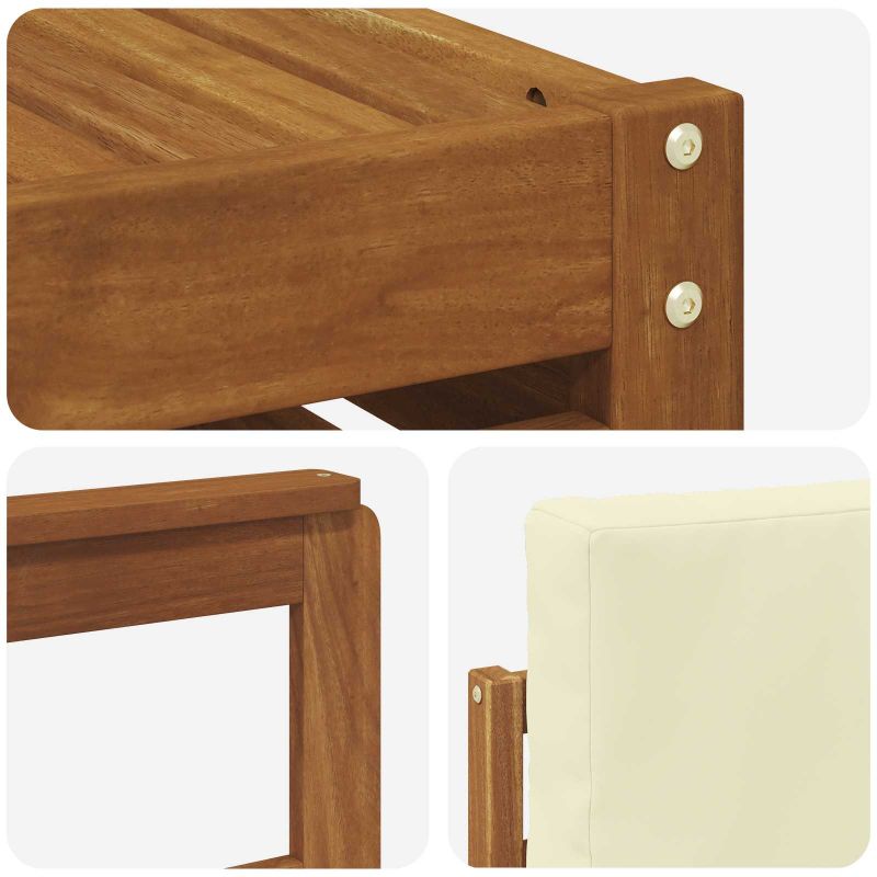 Комплектът за открито съчетава стил и практичност, създавайки център на вниманието на всяка градина или тераса. Неговият модерен дизайн с чисти линии добавя елегантност, а материалите осигуряват дълготрайна красота и устойчивост. Издръжлив масивен акациев дървен материал: Този комплект от масивна акациева дървесина е устойчив на климатични условия и предлага надеждност. Красивият естествен нюанс придава стил на всяка градина. Дизайн, устойчив на време: Лакираната повърхност осигурява защита срещу слънце и дъжд, запазвайки мебелите привлекателни и функционални за дълго. Компоненти и дизайн: Всеки детайл е проектиран за комфорт и стил, а дизайна осигурява визуално единство, подходящо за всякакви събирания. Комфорт и многофункционалност: Модулният дизайн позволява различни конфигурации, идеални за всякакви нужди - от релаксация до социални вечери. Лесна поддръжка: Чистете веднъж седмично с влажна кърпа, за да поддържате външния вид на мебелите. Устойчивият им материал намалява нуждата от честа поддръжка.