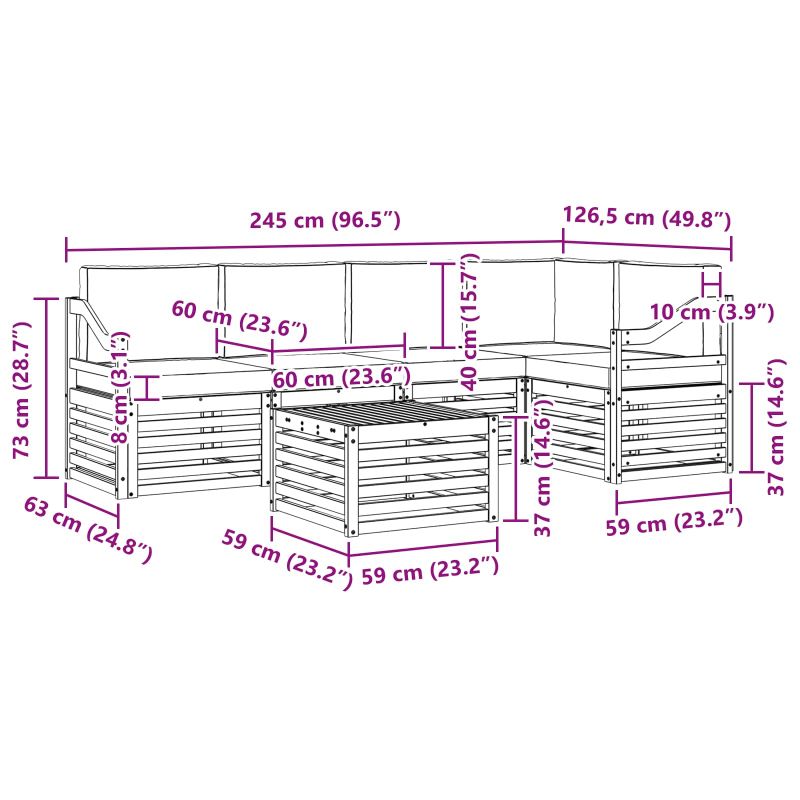Комплектът за открито съчетава стил и практичност, създавайки център на вниманието на всяка градина или тераса. Неговият модерен дизайн с чисти линии добавя елегантност, а материалите осигуряват дълготрайна красота и устойчивост. Издръжлив масивен акациев дървен материал: Този комплект от масивна акациева дървесина е устойчив на климатични условия и предлага надеждност. Красивият естествен нюанс придава стил на всяка градина. Дизайн, устойчив на време: Лакираната повърхност осигурява защита срещу слънце и дъжд, запазвайки мебелите привлекателни и функционални за дълго. Компоненти и дизайн: Всеки детайл е проектиран за комфорт и стил, а дизайна осигурява визуално единство, подходящо за всякакви събирания. Комфорт и многофункционалност: Модулният дизайн позволява различни конфигурации, идеални за всякакви нужди - от релаксация до социални вечери. Лесна поддръжка: Чистете веднъж седмично с влажна кърпа, за да поддържате външния вид на мебелите. Устойчивият им материал намалява нуждата от честа поддръжка.