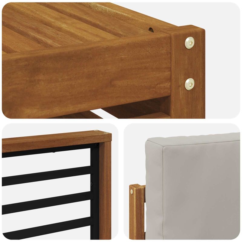 Комплектът мебели за открито комбинира стил и практичност, създавайки централна точка за всяка градина или тераса. Със съвременния си дизайн, който включва ясни линии и минималистични детайли, той привнася елегантност и насърчава спокойствието и социалните събирания на открито. Направен е изцяло от акациева дървесина, което гарантира продължителна визия и здравина, идеален за тези, които ценят както практичността, така и стилния вид на откритите мебели. Издръжлива масивна акациева дървесина: Този комплект мебели за открито е известен със своята издръжливост на външни условия. Солидната му конструкция предлага стабилност, а топлият естествен нюанс обогатява всяко дворно пространство. Устойчив на времето дизайн: Лакираната повърхност осигурява допълнителна защита от слънце и дъжд, а полираното покритие запазва вида и функциите му за дълго. Компоненти и дизайн: Всеки детайл е замислен с акцент на стил и функционалност. Поддържащите елементи предлагат комфорт, а концепцията гарантира визуална хармония за разнообразни външни поводи. Комфорт и гъвкавост: Модулният дизайн осигурява адаптивност към различни пространства и нужди. Идеален за релаксация и социални събирания, той лесно се вписва в всяка външна среда. Лесна грижа и поддържане: Поддържайте мебелите в добро състояние с помощта на влажна кърпа и избягвайте абразивни средства. Редовната грижа запазва стила и увеличава живота на мебелите.