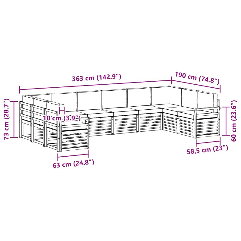Този комплект е съчетание от стил и практичност, което ще се превърне в звезда на всяка градина или тераса. С модерен дизайн с изчистени линии и минималистични детайли, той придава елегантно усещане и удобство за открито релакс и социални срещи. Изцяло изработен от масивна акациева дървесина, комплектът осигурява дълготрайност и отлично визуално излъчване, което го прави идеален за всеки, който търси не само красиви, а и практични мебели за открито. Издръжлива масивна акациева дървесина: Този комплект е изработен от масивна акациева дървесина, позната със своята дълготрайност и устойчивост на всякакви атмосферни условия. Здравата му конструкция предлага стабилност и сигурност, а топлият естествен цвят е чудесно допълнение към градината или терасата. Устойчив на метеорологични условия: Декорът е с лакирана повърхност, която осигурява защитен слой срещу слънце и дъжд. Полираното покритие гарантира, че визуалният вид и функциите остават непокътнати, осигурявайки дълголетие на вашата тераса или двор. Компоненти и дизайн: Всеки елемент на мебелировката е проектиран с мисъл и за стил, и за удобство. Поддържащите функции предлагат допълнителен комфорт, а кохезивният дизайн осигурява визуално приятно изживяване за всякакви открити поводи. Комфорт и гъвкавост: Модулният дизайн позволява разнообразие от конфигурации, като идеално се приспособява на различни места и нужди. Перфектен е за релаксация, забавления с приятели или просто спокойствие с книга на брега на басейна, а комфорта е максимизиран. Лесна поддръжка: За да запазите мебелите в добър вид, просто ги почиствайте с мокра кърпа и избягвайте агресивни препарати. Редовната поддръжка е важна за съхранение на естетичния вид и дълголетието на мебелите.