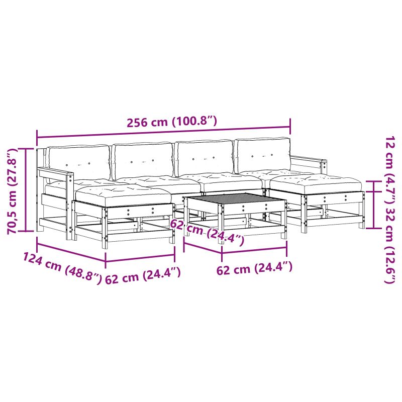 Този модула комплект мебели за градина е направен, за да предложи максимален комфорт и стил за вашето открито пространство. Съвременният му вид се вписва безпроблемно в градината или на терасата. Солидната му конструкция, елегантните линии и гладките текстури създават уютна атмосфера, подходяща за всеки, който иска да подобри външната си обстановка. Модулният характер позволява да се разполага гибко, така че да се адаптира към различни нужди за сядане по време на събирания или почивка. Солидна борова конструкция Всеки елемент от комплекта е изработен от ръчно обработена масивна борова дървесина. Тази селекция не само че изглежда добре, но е и здравата и дългогодишна. Борът издържа на различни климатични условия, което го прави стилен и издръжлив. Включени компоненти Чудесният комплект включва маса, ъглов диван, две средни диван, две облегалки и уютна възглавница. Всеки елемент взаимодейства, за да създаде единна атмосфера на сядане. Маса с размери 62 x 62 x 30 см е идеална за напитки и декорации, а диваните и облегалките предлагат уютно пространство за разговори. Функционален дизайн Модулният дизайн позволява различни конфигурации на сядане. Това означава, че можете да се наслаждавате на събирания или спокойни вечери, комплетът ще се адаптира към вашите нужди. Квадратните подлакътници и крака добавят стабилност и стил, комбинирайки функционалността с модерната естетика. Препоръчителна настройка Перфектен е за градински паркове, тераси или други открити пространства. Гладките текстури и неутрални тонове лесно се вписват в естествени околности, носейки комфорт на вашето уединено място. Под звездите или на слънце, този комплект предлага уютно място за отдих през всичките сезони. Инструкции за грижа Запазете красотата на комплекта, като избягвате пряката слънчева светлина, когато не го използвате. Покривайте го с водоустойчиво покритие при лошо време. Прибирайте възглавниците вътре, за да удължите живота им и да запазите комфортен вид. Упражнявайте тези лесни грижи, за да запазите страхотното му състояние и да се наслаждавате на луксозния отдих навън.