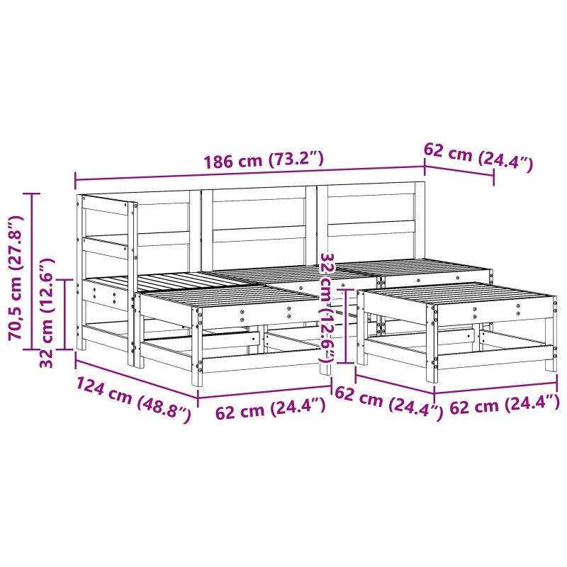 Този комплект за градински мебели е класика за всяка градина или тераса, съчетаваща модерен стил с практичност. Направен от качествена борова дървесина, излъчва естествена красота, която е идеална за свободно време или гости. Гладките линии и стилният дизайн осигуряват елегантен вид, като лесно се вмесва в различните външни пространства. С модулния си дизайн можеш лесно да пренареждаш частите, за да създадеш идеалното място за нуждите си. Масивна борова дървесина Направен изцяло от масивна борова дървесина, предлагаща здравина и естествена елегантност. Борът е идеален за външни мебели, устойчива на различни условия. Многофункционални компоненти Комплектът включва ъглов диван, два средни дивана, маса и табуретка, което осигурява разнообразие за всякакви нужди. С квадратни крака и стабилна рамка, той е създаден за комфорт. Модулна гъвкавост Проектът позволява лесно променяне на конфигурации според пространството или повода. Можеш да го приспособиш за малки вечеринки или по-големи събития. Външна полезност Специално проектиран за градина или тераса, той е подходящ за различни условия. Създава атмосфера и е идеален за свободни активности. Защитна грижа Лесно е да запазиш мебелите в добро състояние. Пазете ги от слънце и дъжд с покривала. Внасяйте възглавниците, ако времето е лошо.