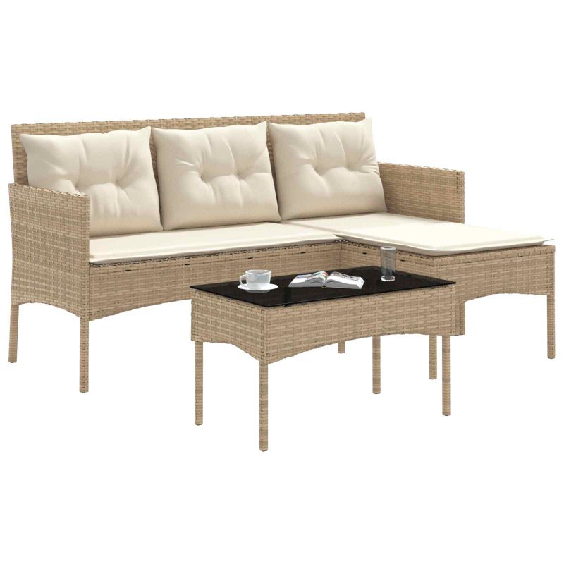 Този съвременен комплект градински диван ще променя начина, по който прекарвате времето си навън. С елегантни линии и минималистичен вид, той придава уют на всяка градина или тераса. Перфектен е за събирания с приятели или за спокойно лично време. L-образната форма го прави универсално решение, което пасва на всякакви външни пространства. Съчетава функционалност и елегантност, идеален за модерни домове, търсещи стил и комфорт. Издръжлив полираатан: Този комплект мебели за градина е изработен от PE ратан, който е устойчив на UV лъчи и дъжд. Дори през сезона ще изглежда добре и ще е функционален. Устойчив стоманен каркас: Комплектът е подсилен със стоманен каркас, който му дава стабилност и дълготрайност. Праховото покритие добавя модерен вид и го прави още по-здрав. Стъклен плот: Включва маса с стъклен плот, която е стилна и удобна за разни неща – напитки, закуски или украса. Тя съчетава функционалност и стил. Удобни възглавници: С полиестерни възглавници, комплектът е супер удобен. Лесни за почистване благодарение на циповете, така че можете да се насладите на комфорта му за дълго. Основни инструкции за грижа: Просто избършете с влажна кърпа и, при нужда, използвайте водоустойчиво покривало, за да го предпазите. Така поддържате привлекателността на комплекта.