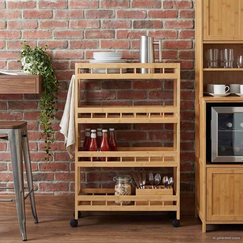 Добавете стил и удобство в кухнята с нашата количка на колела от бамбук. С правоъгълния си дизайн, тя лесно пасва на всякакви интериори и е практична. Размерите 60 x 18 x 97 см са идеални за всяко пространство, независимо дали е голямо или малко. Качествен бамбук: Изработена от бамбук, количката има естествен и топъл вид. Бамбукът е здрав и устойчив, и запазва красотата си с времето. Лесна подвижност: С 4 въртящи колела, количката се мести безпроблемно на всякакви повърхности. Две от колелата имат спирачки за сигурно задържане. Обширно съхранение: Количката разполага с 4 етажа, които ви помагат да организирате кухненските принадлежности и декорации лесно. Модерен вид: Съчетава чисти линии и естествени тонове, вписва се в съвременните и минималистични стилове. Лесно сглобяване: Инструкциите за сглобяване са стъпка по стъпка и изискват само отвертка и двама души.
