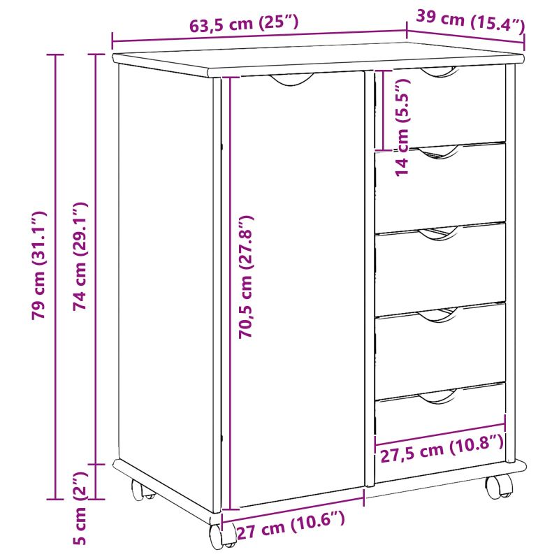 Това минималистично шкафче на колела е идеалното съчетание от стил и функционалност за съвременни домове. Проектирано да се вписва лесно във всяка стая - от учебната стая до всекидневната и спалнята, то предлага елегантност с изчистените си линии. Правоъгълната форма крие разнообразни отделения за съхранение, позволявайки на потребителя лесно и стилно да организира всичко. Без значение дали става дума за офис принадлежности, книги или лични вещи, това шкафче помага да управлявате безпорядъка и допринася за естетиката на стаята. Издръжливост от масивна борова дървесина Проектирано да устои на ежедневна употреба, шкафчето е направено от масивна борова дървесина. Естествената здравина на бор се грижи за дълготрайност и устойчивост, предлагайки надеждно решение за разнообразни нужди в дома. Матово покритие допълва здравата му структура, придавайки приятен вид и тактилност. Многофункционални рафтове и чекмеджета С регулируеми рафтове, които улесняват разпределението на предмети от различни размери. Плъзгащите се чекмеджета с ролки се движат лесно, което увеличава удобството. Тези компоненти позволяват безпроблемна организация на основните неща и правят шкафа адаптивен за различни нужди. Лесна подвижност С четирите си колелца, шкафът лесно се движи из стаите, отговаряйки на динамиката на живота. Без значение дали премествате шкафа в другата стая, колелцата осигуряват гъвкавост без усилия. Лесен достъп до вратите Вратите с панти, изработени за здравина и дискретност, предлагат лесен достъп до съдържанието, запазвайки опростения стил. Дизайнът им осигурява дълготрайност и удобство при използване. Ниска поддръжка За поддържане на елегантния вид, просто избършете шкафа с влажна кърпа и избягвайте агресивни химикали. Тази грижа минимизира усилията, докато запазва безупречния му вид и удължава живота му.