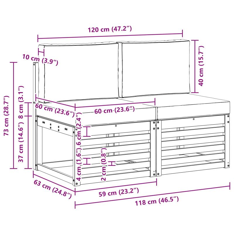 2 Брой Среден диван за открито Солидно акациево дърво Естествен