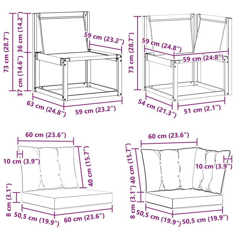 • 2 x Среден диван: 59 x 63 x 73 см (ДxШxВ)