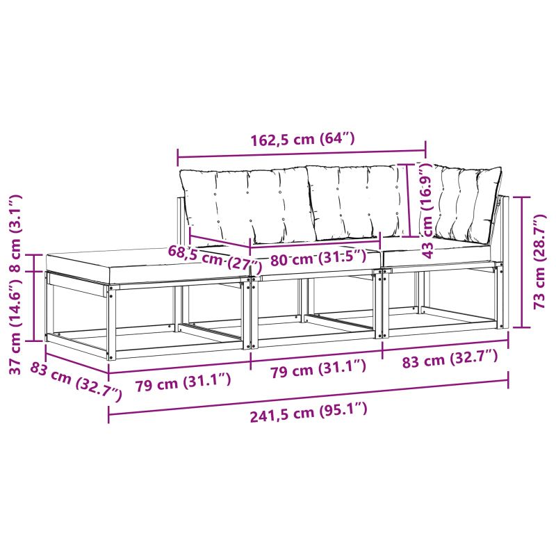 Този комплект мебели за открито преобразява всяка тераса, балкон или градина в стилно и удобно място за релакс, идеално за почивка или социализиране. С модерен и минималистичен дизайн, той предлага гъвкаво разположение, подходящо за различни открити обстановки. Изработен с внимание към детайлите, комплектът подобрява визуалната привлекателност на пространството и осигурява моменти на спокойствие и елегантност. Солидна акациева дървесина: Здравият акациев материал е устойчив на атмосферни условия и предлага надеждност и дълготрайност. Натуралният нюанс на дървото добре се вписва в открития декор, като е функционален и стилен избор за вашата тераса. Удобни възглавници: Всяка част идва с възглавници от полиестер, които осигуряват комфорт и дълговечност. Тъканта е мека и устойчива на открити условия. Съчетава се с пяна за оптимален комфорт при дълги сесии. Модулярен и гъвкав дизайн: Модулният формат позволява различни подредби в зависимост от пространството и нуждите. Можете да създадете идеалното оформление, независимо дали е компактно или по-голямо за социални събирания. Устойчив на атмосферни условия: Проектиран за външни условия, мебелите предлагат устойчивост на различни атмосферни влияния. Повърхността позволява въздушен поток и помага на материала да изсъхне бързо след дъжд, запазвайки комфорта и издръжливостта. Устойчив материал: Тъканта Textilene е проектирана да не избледнява, дори при слънчево излагане, като запазва визията си с времето. Неговата издръжлива повърхност е устойчива на избледняване и осигурява дълготрайни резултати, дори навън.