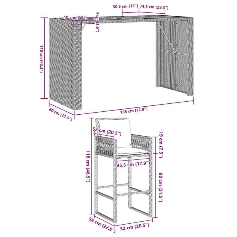 Този модерен градински бар комплект, съчетаващ както стил, така и функционалност, със сигурност е предназначен да бъде центърът на вашата градина, вътрешен двор и всяко друго жилищно пространство. Материал, устойчив на атмосферни влияния: PE ратан, известен също като полиратан, е устойчив на атмосферни влияния и лесен за почистване. Той остава красив отвън за дълъг период от време. Предлага отлично качество, удобство и естетичен вид.Удобство при седене: Бар табуретката е проектирана с облегалка и вградена опора за крака, за да ви предложи удобно изживяване при сядане. Дебело подплатената възглавница на седалката осигурява максимален комфорт по време на седене.Здрава и стабилна рамка: Прахово боядисаните стоманени рамки правят пъб комплекта здрав и стабилен за ежедневна употреба на открито.Широки приложения: Бар масата с табуретки със своя забележителен дизайн създава приятна цялостна визия, която се интегрира без усилие във всяка среда. Добре е да се знае:За да бъде сглобяването възможно най-лесно, всеки продукт се доставя с ръководство.Забележка:За да сте сигурни, че вашите външни мебели ще останат красиви, ви препоръчваме да ги защитите с водоустойчиво покривало. Максимално 110 кг на седалка. Съобразете се с риска от открит огън и други източници на силна топлина в близост до продукта.