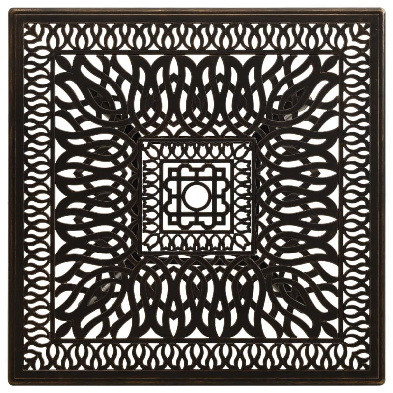 Този бистро комплект, изработен от лят алуминий, осигурява удобно преживяване при седене за вас и вашите гости. Градинските столове и маса, изработени от алуминий, са здрави и издръжливи. Устойчивият на ръжда и на атмосферни влияния материал прави комплекта мебели идеален за използване на открито. Красивите шарки правят бистро комплекта елегантно допълнение към вашето външно пространство. Освен това масичката за кафе има отвор за чадър, който може перфектно да побере чадъра ви, за да ви предпази от слънце или дъжд. Забележка: За да удължите живота на вашите градински мебели, препоръчваме ви да ги почиствате редовно и да не ги оставяте ненужно на открито без защита.Почистване: Използвайте мек сапунен разтворСъхраняване: Ако е възможно, съхранявайте на хладно и сухо място на закрито. Ако продуктът се съхранява на открито, защитете го с водоустойчиво покривало. Избършете и изсушете излишната вода или сняг от плоските повърхности след дъжд или снеговалеж. Позволете достатъчно циркулация на въздуха, за да избегнете повреди, свързани с влагата. Максимално 110 кг на седалка.