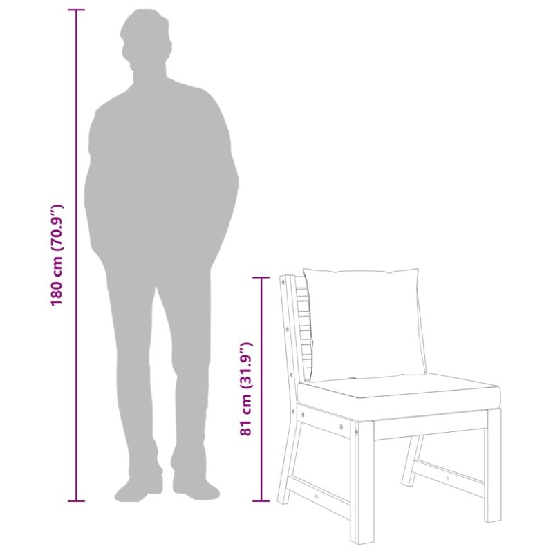 Насладете се на свободното си време с нашия модулен среден диван. Този лаундж диван подхожда перфектно както на закрито, така и на открито пространство. Този междинен диван е изработен от масивна акациева дървесина за максимална издръжливост, която е подходяща за вътрешен двор, градина, веранда, край басейна или всякакви открити площи. Акациевото дърво е тропическа твърда дървесина, устойчива на атмосферни влияния и издръжлива. Дебелите подплатени възглавници за седалката и облегалката ви осигуряват допълнителна опора и комфорт във времето за почивка. Той може да се комбинира с други продукти от нашия магазин, така че клиентът да създаде собствен комплект.