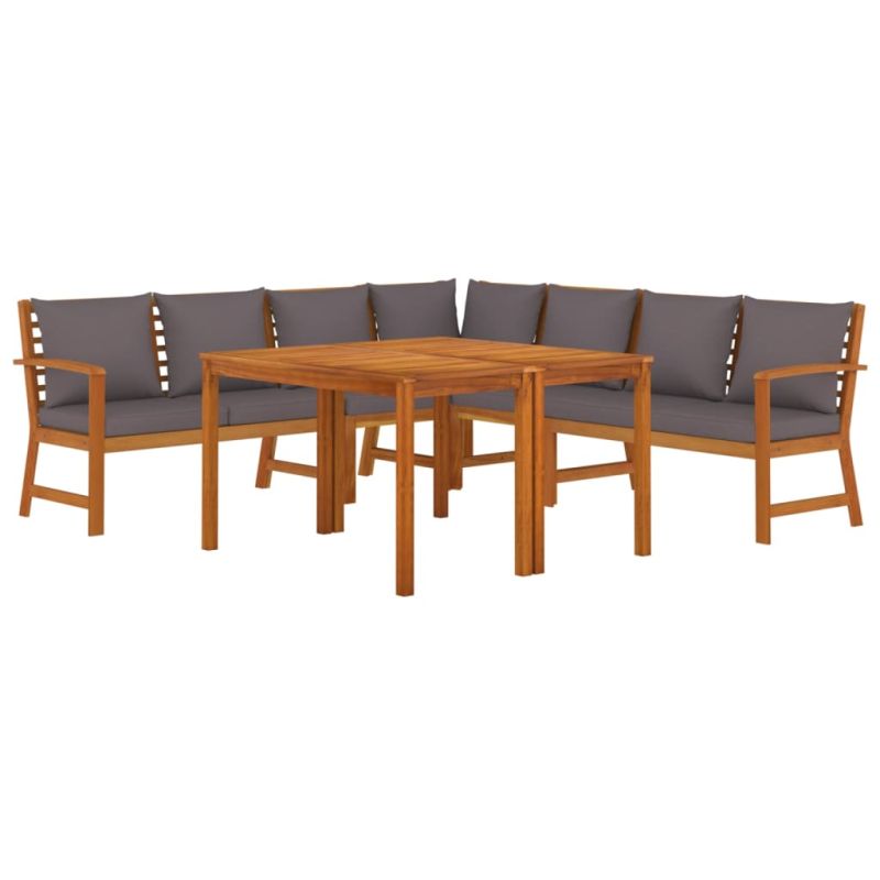 С непреходен дизайн този дървен трапезен комплект с възглавници добавя нотка на рустик чар към вашия вътрешен двор, тераса или градина. Устойчив материал: Масивното акациево дърво е красив естествен материал. Акациевото дърво е тропическа твърда дървесина, която е плътна, здрава и издръжлива.Стабилна рамка: Дървената рамка на трапезния комплект осигурява здравина и стабилност.Практична маса: Масата предоставя място за храна, напитки и други декоративни предмети.Модулен дизайн: Всяка част е лесна за преместване, което ви улеснява да създавате различни оформления, които отговарят на вашите нужди. Можете също да намерите други сегментни модули със същия дизайн и стил в нашия магазин, за да подредите свои собствени аранжировки на мебели.Удобно седене: Градинският трапезен комплект е много удобен благодарение на дебело подплатените възглавници за сядане и облягане. Добре е да се знае:За да бъде сглобяването възможно най-лесно, всеки продукт се доставя с ръководство. Забележка:За да сте сигурни, че вашите външни мебели ще останат красиви, ви препоръчваме да ги защитите с водоустойчиво покривало.Масата е по-ниска от обикновените трапезни маси и е особено подходяща за комбиниране с комплект градински меки мебели.